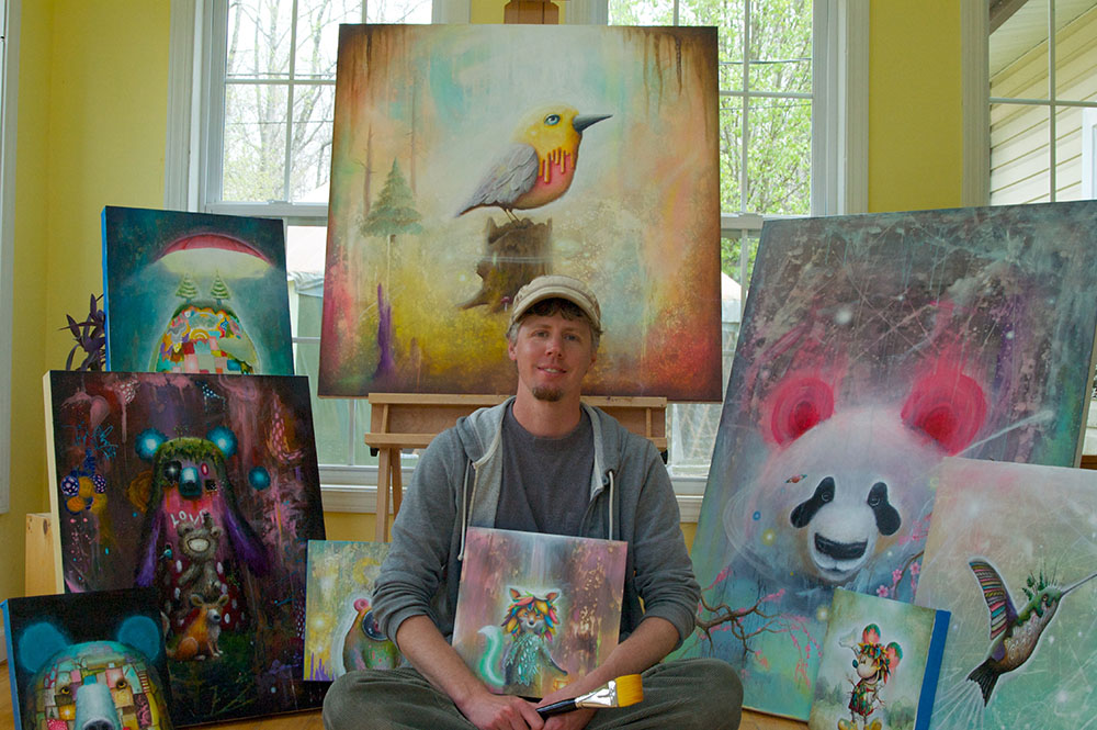 Scott: I often start a piece without an idea in mind. I throw and move paint around on the surface and create a backdrop or environment. I will use rags to smear and lift paint off. I will then look for patterns and shapes in the marks I make to generate the painting. The characters and animals literally grow out of the background. I think this is why the characters in my paintings often seem like they could walk right out of the canvas.
