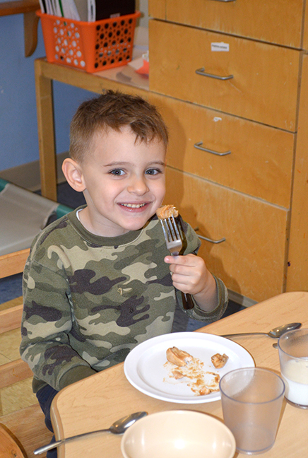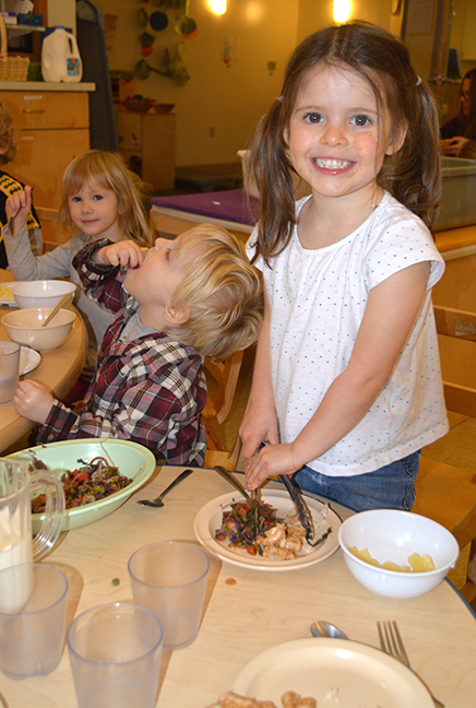 An important part of the Rainbow in My Tummy program is for teachers to eat the same food during mealtime. “If other children are eating the food, and the teachers are eating the food and talking about how yummy it is, the other children are much more likely to eat it,” says Jacque Penick, executive director of Verner.