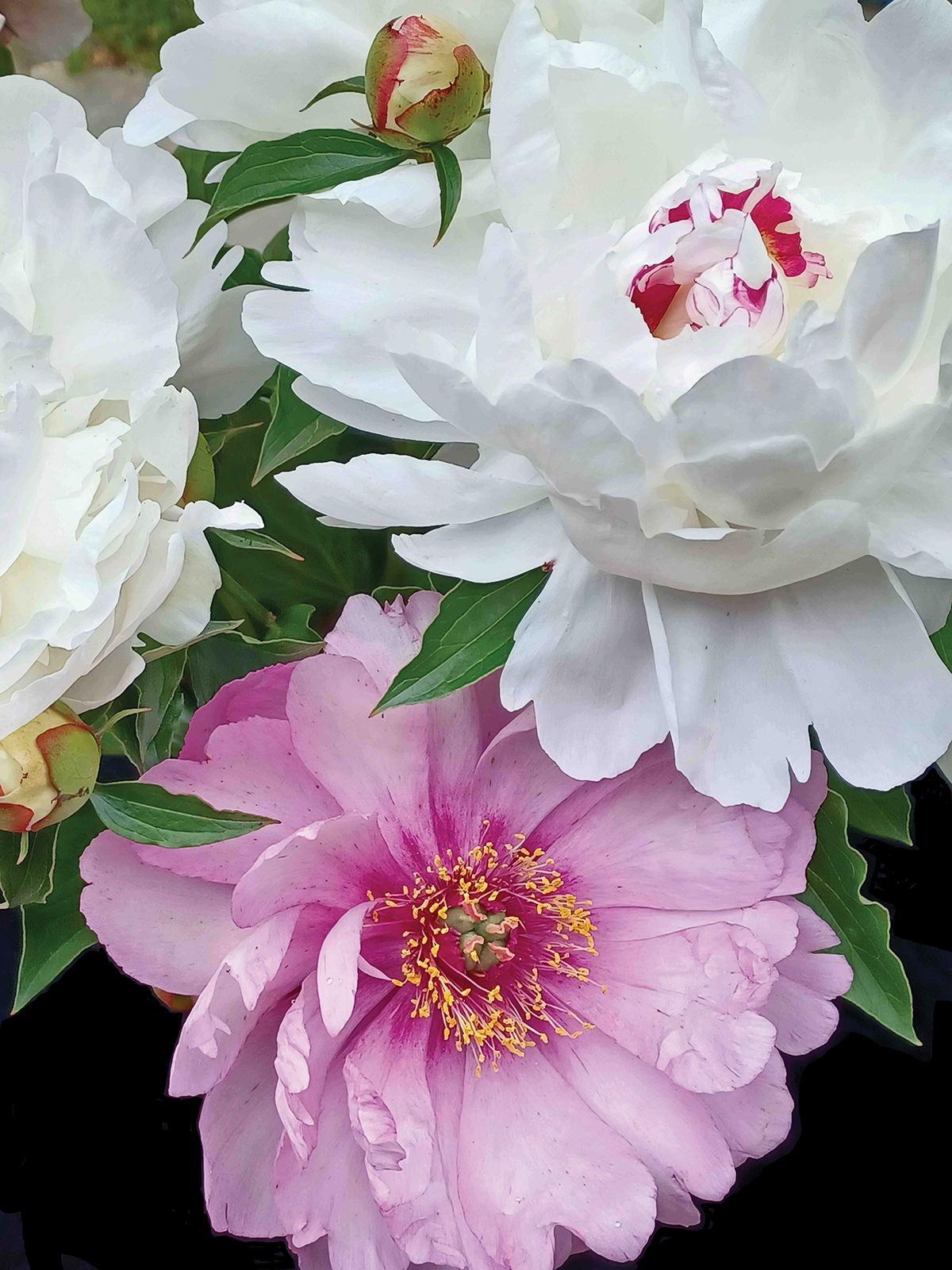 A Festiva Maxima peony blooms with a pink Itoh peony. Photo by Judith Canty Graves