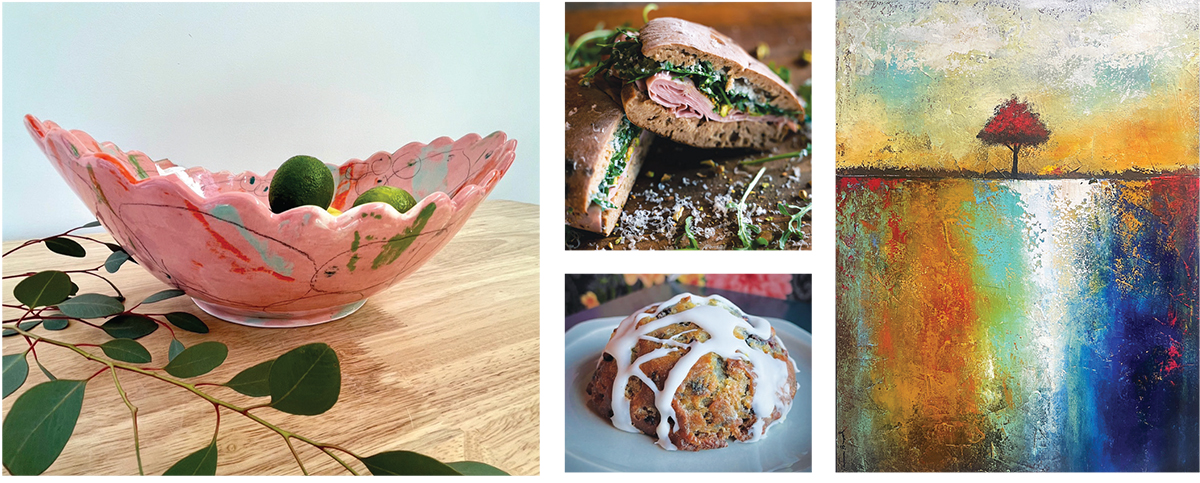 (Clockwise from left) Angelique Tassistro, artist; Sandwich from Piccolina; Above and Beyond. Jaime Byrd, artist; Scone from ButterPunk