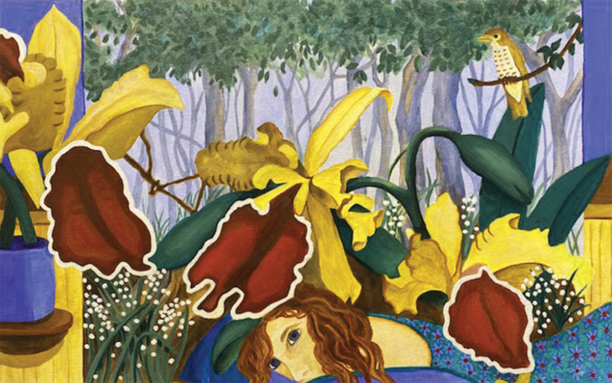Women are the central subject matter in Edwards’ art, which is deeply influenced by several years spent living and making art in a remote cabin in Australia. “I still have a deep inner longing to merge with my natural surroundings as I did when I lived off-grid in Australia,” she says. “By painting women submerged in nature I kind of get to scratch that itch.”