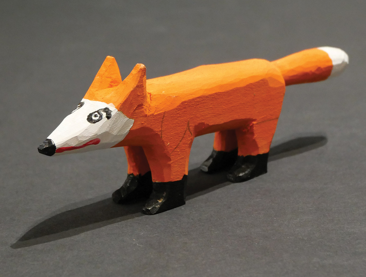 Woodcarver Minnie Adkins began her artistic journey with small creations: toys such as slingshots and pop-guns she whittled for herself as a child. “After I was an adult, I started looking at that slingshot, and it looked like legs,” she says, “and I thought if it had a head and a tail, it could be a rooster.” Today, she is known for painted woodcarvings of foxes, bears, horses and possums, as well as roosters. In Sandy Hook, KY, near her hometown of Isonville, Minnie Adkins Day is held annually on the third Saturday in July. “I sell a lot there,” Adkins says, adding, “The good part is that it’ll always be there after I’m gone, and the artists will have a market.”