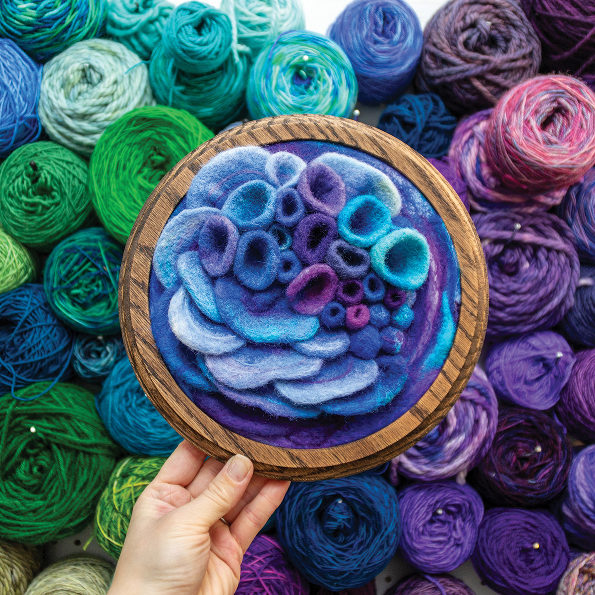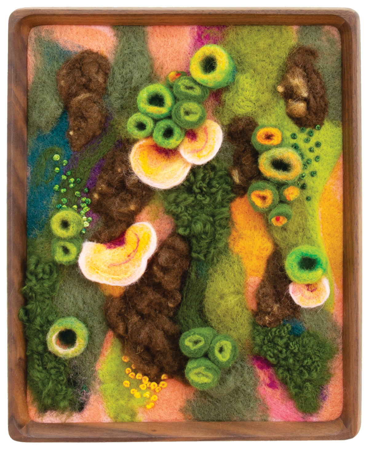 The forest floors, mushrooms and corals created in wool by Amy Reader are the most current manifestation of a life-long enchantment with fiber. As a six year old, she made tiny clothes for her stuffed animals after a short introduction to the sewing machine by her grandmother and then by watching VHS tapes. She quickly progressed to sewing pillow cases and skirts, then learning to crochet.