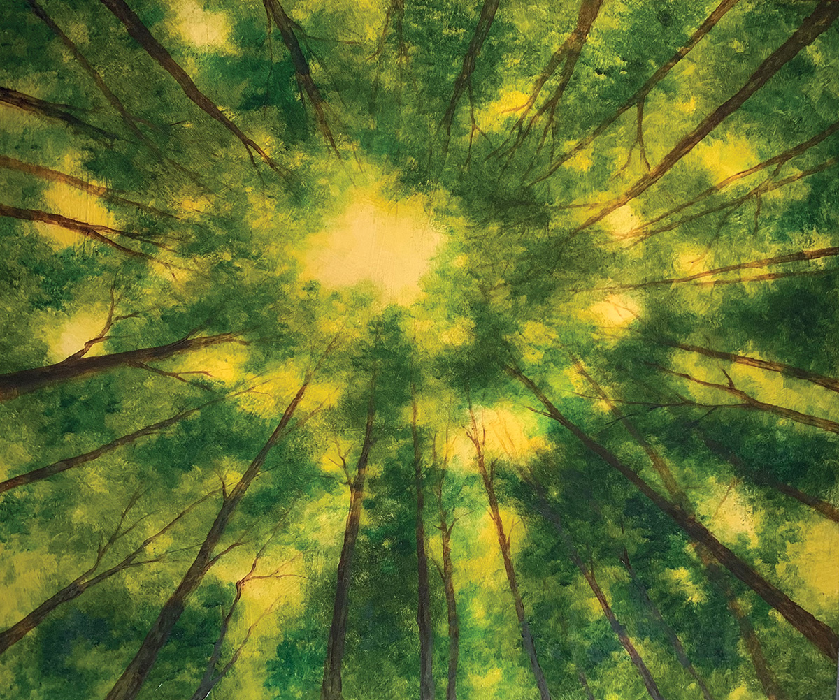 Stern’s paintings draw from places she has known—gardens, forests, waterfalls—but they are filtered through recollection rather than strict realism. Many of the pieces are rooted in specific locations, including botanical gardens and regional landmarks, yet they are rendered with an atmospheric quality that emphasizes mood and memory over exact detail.