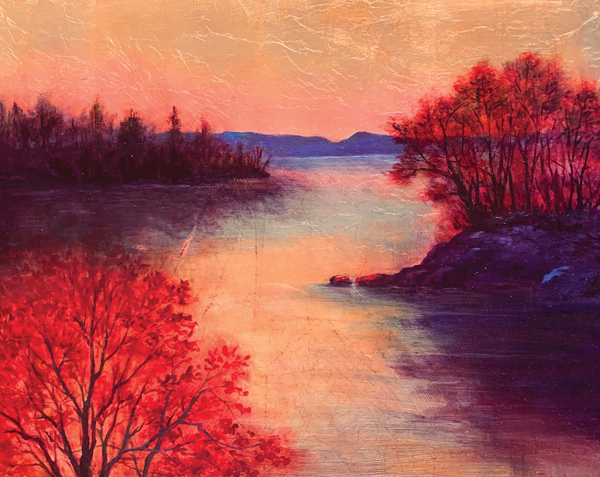 Central to this body of work is Stern’s use of a metallic underlayer, a technique that adds both technical complexity and visual depth. As viewers move around each painting, light interacts with the surface, subtly shifting colors and tones. “Gold leaf has a rich history in sacred art, from Egyptian tombs to medieval manuscripts,” says Stern. “Real gold leaf is too expensive for me—I employ imitation leaf made from copper and zinc—but the modern alloys are remarkably convincing. I love the depth and luminosity I’ve been able to achieve.”