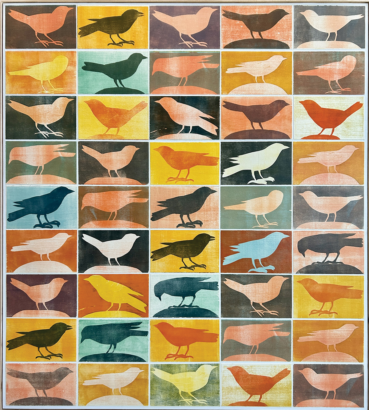 Ambler’s work for the show is a study in contrasts, with the wooden elements he employs for woodblock printing used to create quilt-like pieces. “I cut woodblock print proofs into shapes that I then assembled into abstract ‘quilt’ collages,” he says. “I wanted to convey the idea of quilts, sometimes made alone but also often by groups of people.” Ideas around quilts suggesting harmony, he adds, include their being made for others in acts of care, the warmth they bring and the intergenerational aspect as they become family heirlooms.