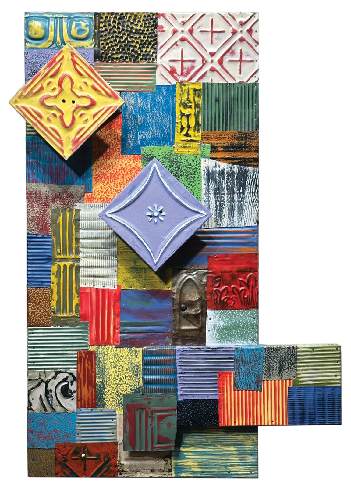 The collaboration with Lee, whose work incorporates a variety of raw materials, adds an additional layer of conversation. “As far as what inspired the show, I felt like Jesse’s use of raw materials—aluminum siding, ceiling tiles, copper—would play well in the same sandbox as my geometric abstract works,” says Nelson. The artists will also be combining their media in a few pieces.