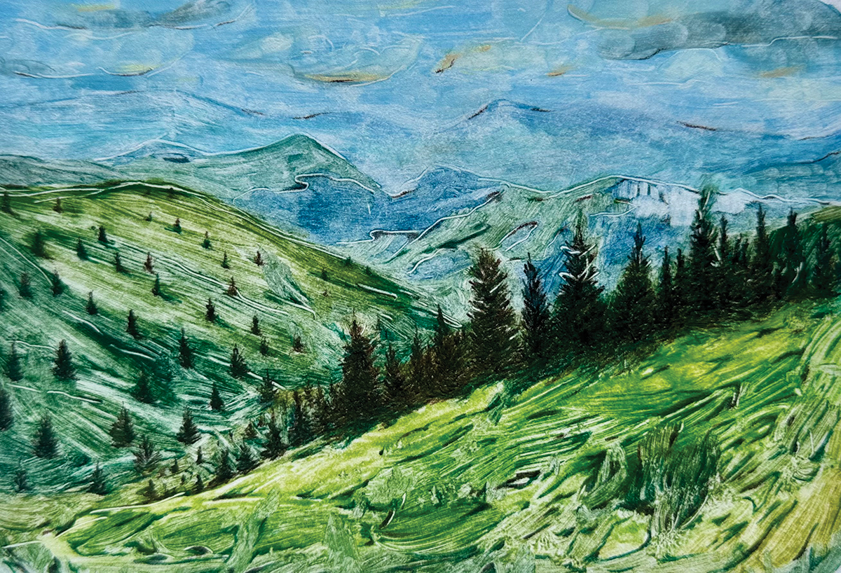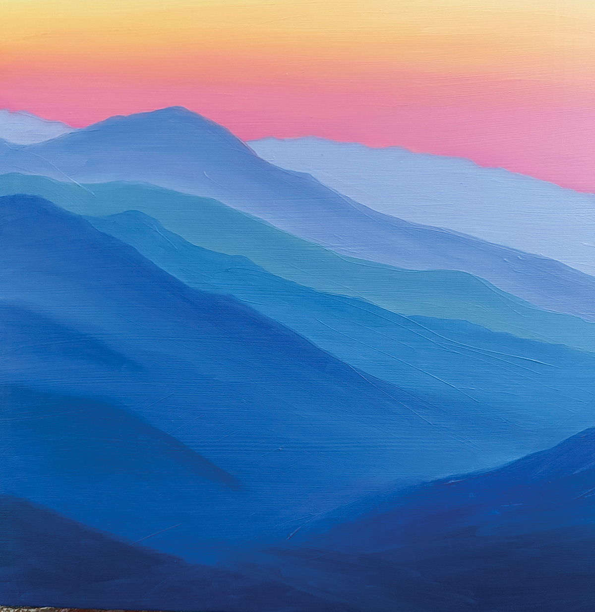 Patricia Hargrove has always regarded with amazement the beauty of the mountains above Asheville, and her work in the show reflects those iconic views. “Anywhere you are in Asheville, one looks to the distance at any number of mountain ranges that have stood for time eternity,” she says. “It is very grounding in nature, as if you are wrapped in a green-blue blanket.”