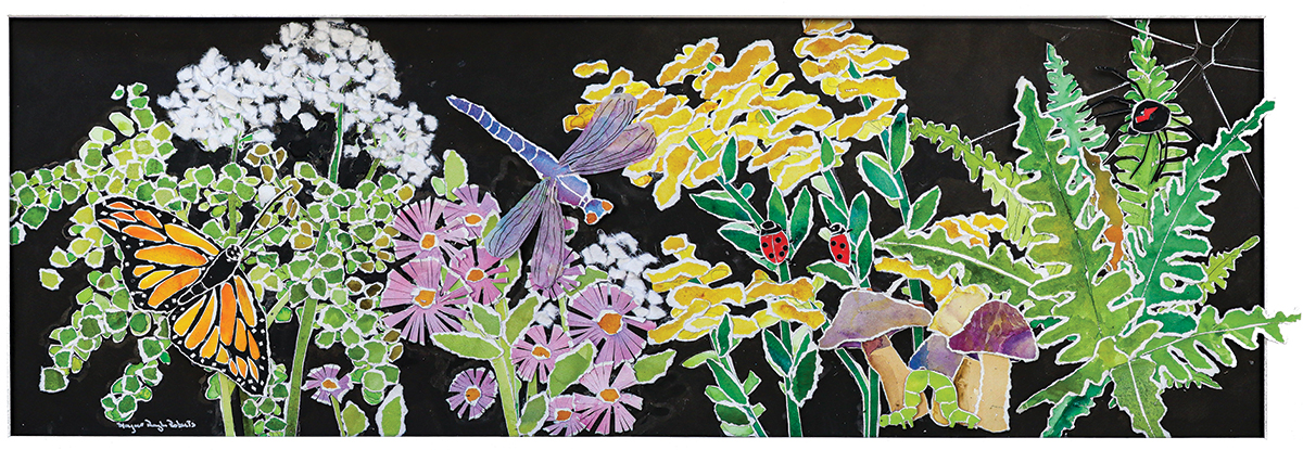 Her collage practice reflects both her love of the natural world and her eye for storytelling. “Foliage is a natural subject with my torn paper collages,” says Roberts. “I try to include different native plants in each of my forest floor series. For the REACH collage, I added, for the first time, a collection of forest critters.”
