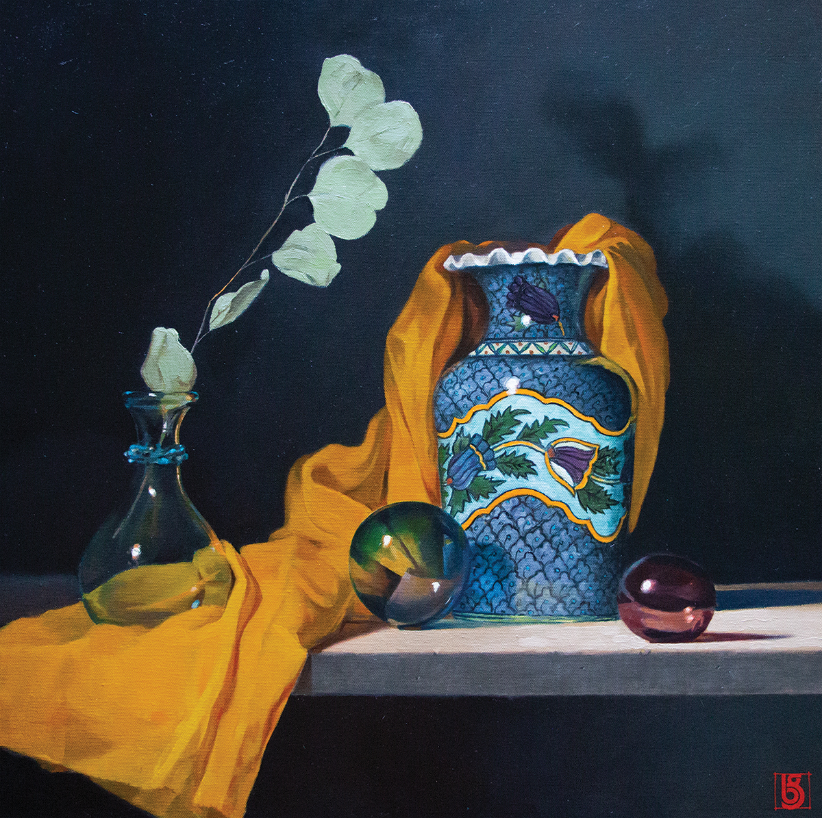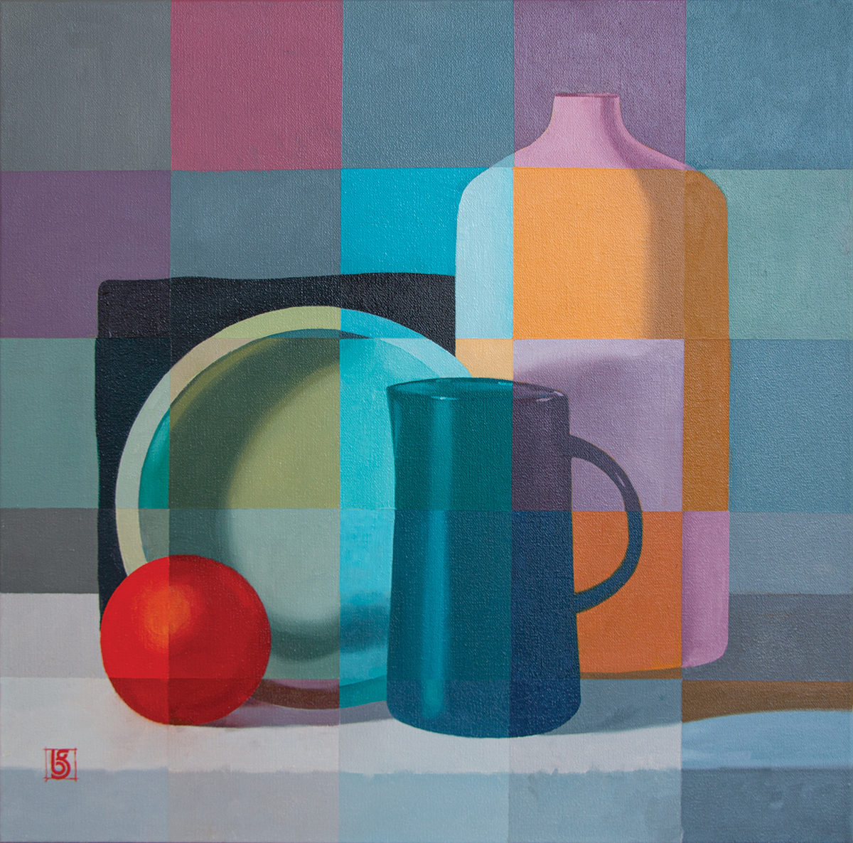 George often challenges himself by planning and executing series of works. “The Square x Square paintings evolved when I thought, why don’t I paint a still life but in an untraditional manner,” he says. “I thought of my icon portraits which are painted in a similar style (with squares) and used that idea to create a still life with an edgier look. Some squares with subtle color changes and some with vibrant color changes.”