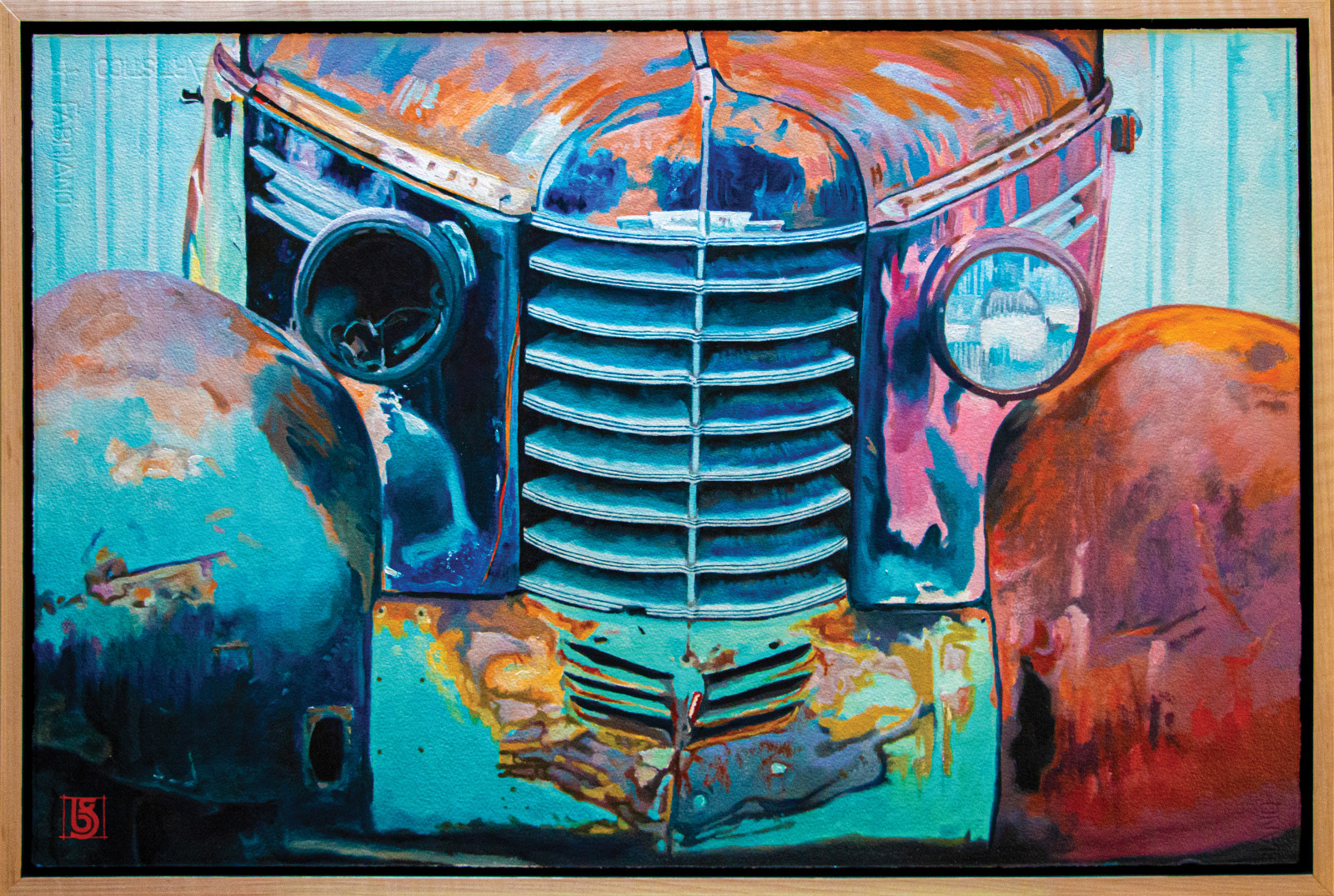 With subjects, he enjoys the unexpected. “I like to show people something they may not have seen, or from a different perspective,” he says. “In my Rust in Peace series, I thought, people are used to seeing new cars, but to make an abandoned car the subject of a painting, that’s something different!”