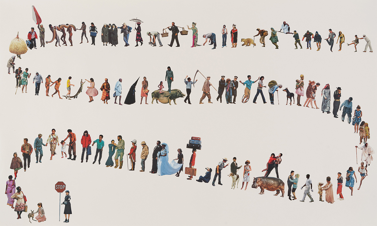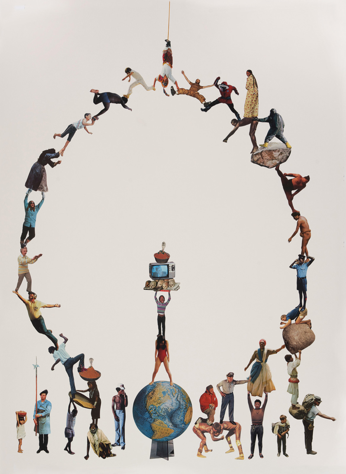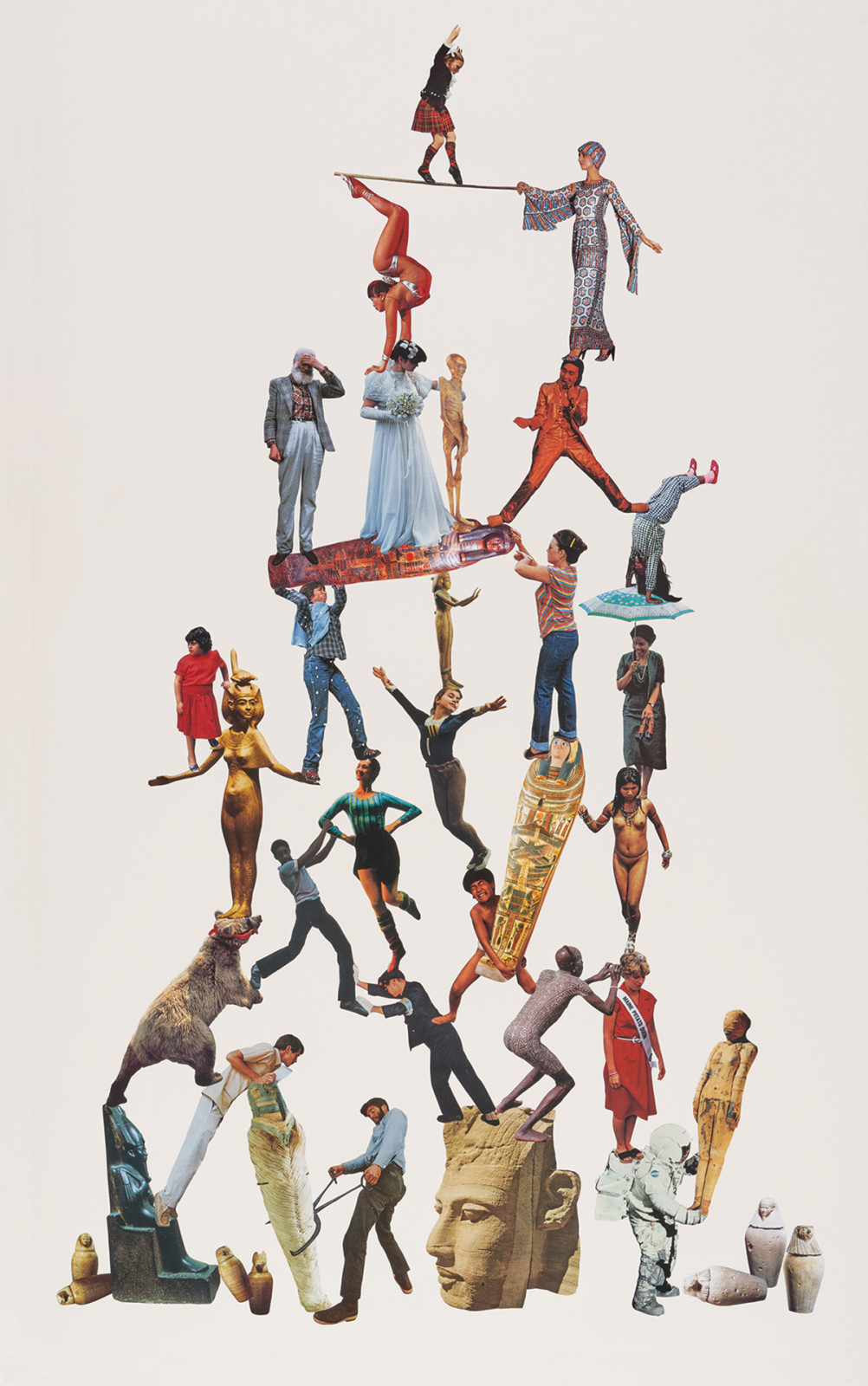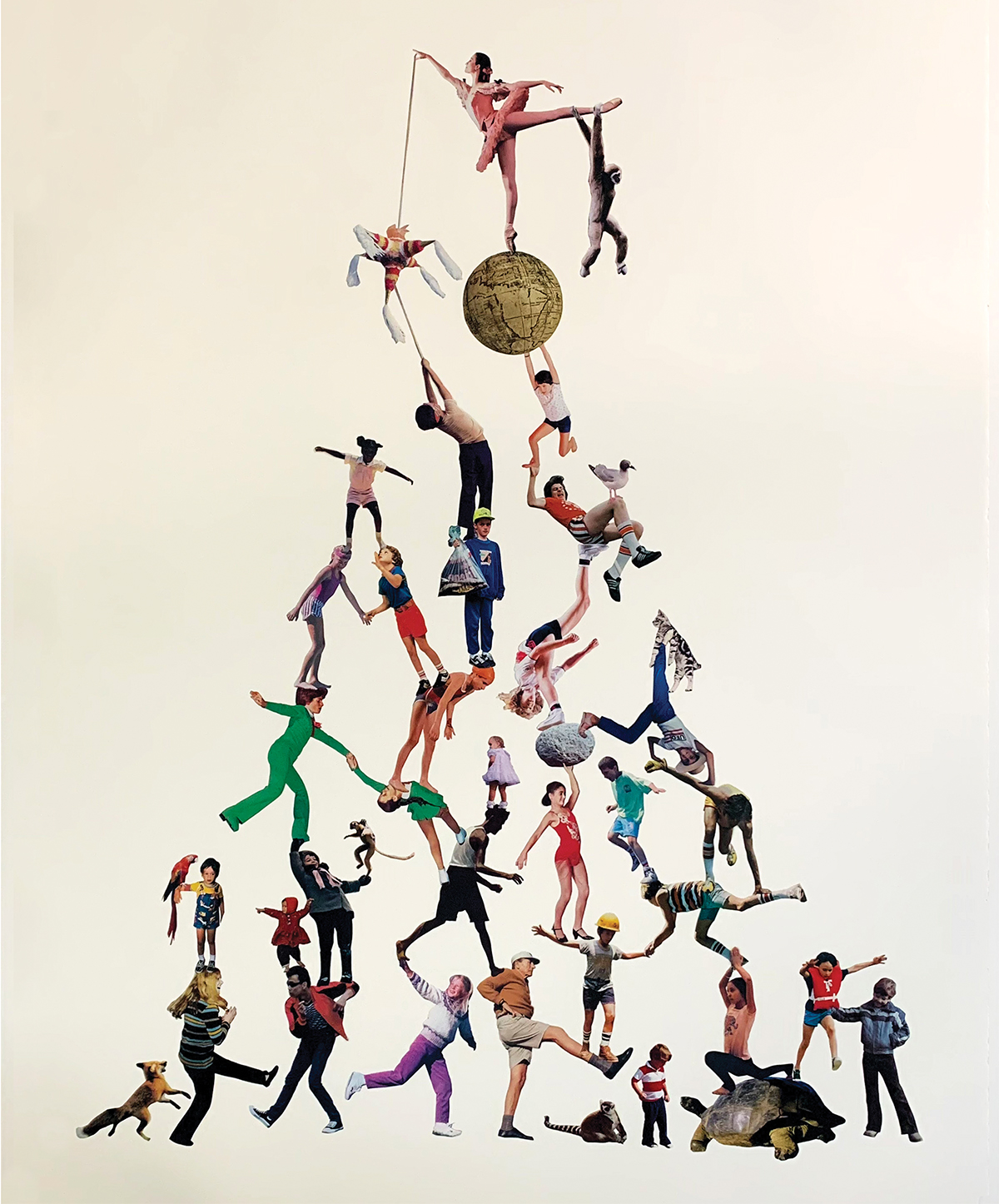 Sours’ stacker pieces are being displayed as part of Blue Spiral 1’s Collection exhibition, running through Wednesday, June 25, in the Lower Level Gallery. “In his Stacker series, Sours transforms found imagery from National Geographic into intricately collaged compositions that are both playful and intentional, words that could also be used to describe Sours himself,” says Blair Guggenheim, assistant director of Blue Spiral 1. “In each piece, figures are meticulously sourced, cut and arranged to form surreal yet cohesive visual narratives—such as a gymnast straddling a meteorite, seamlessly linked to a toddler, a squirrel monkey and a hand-standing figure atop a parasol. Through these unexpected links, Sours creates a delicate choreography of interconnected forms, suggesting that the stasis of the world is, in fact, held together by a dynamic and collective balance of individual forces.”