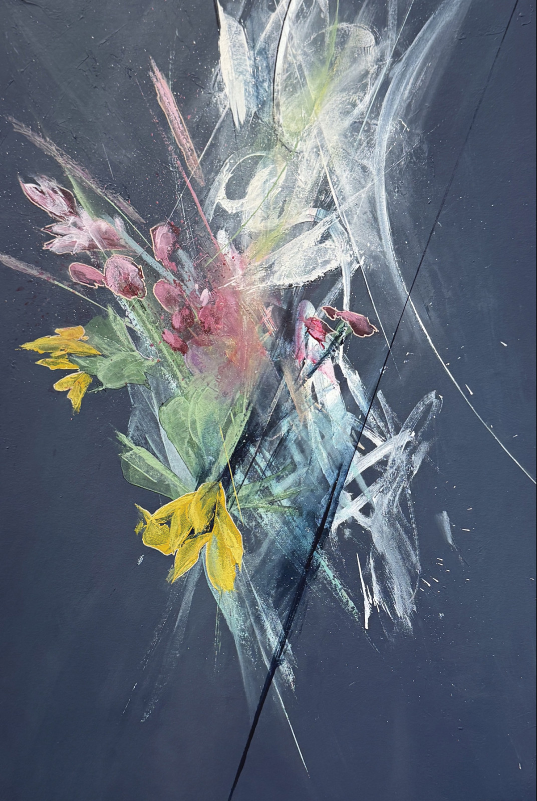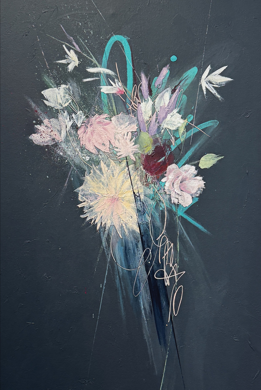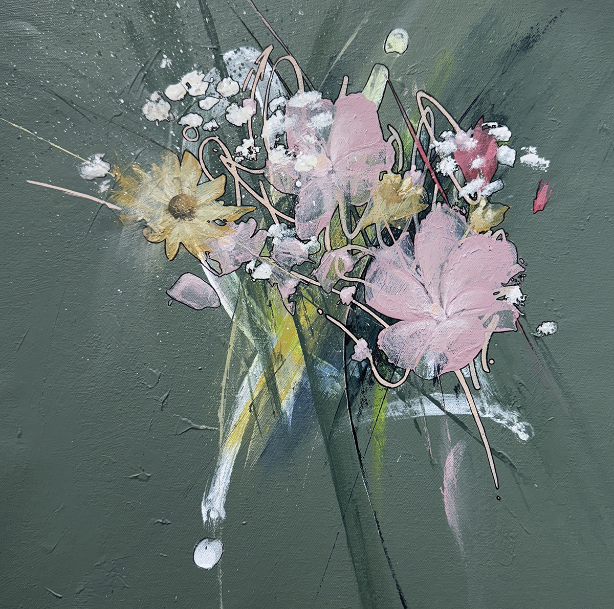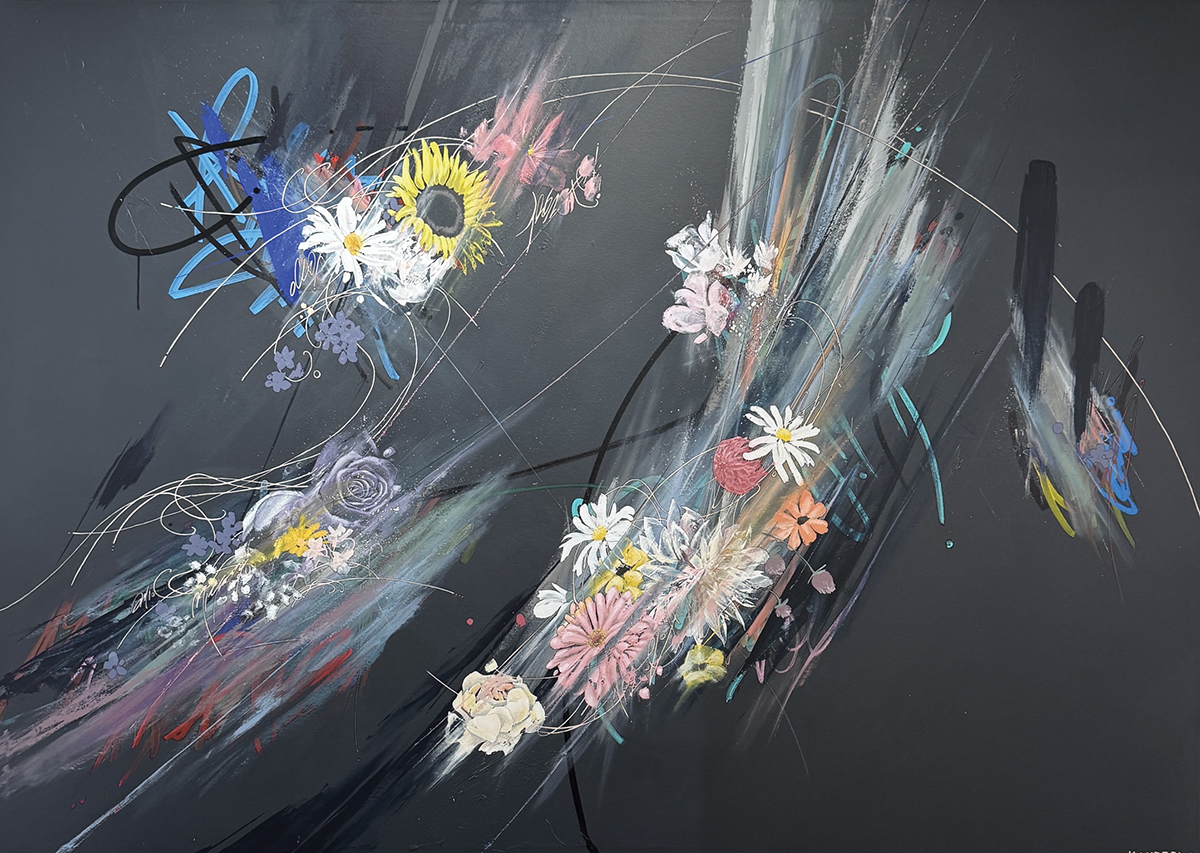 Graffiti, the Art Nouveau movement and abstract expressionist artists of the early to mid-20th century are among the influential styles for him. “My latest work infusing big, bold outlined Art Nouveau flowers with graffiti and a healthy amount of abstract negative space is blowing my mind,” he says. “I love it, and it’s coming from deep within or, hopefully, from the universe.” He adds, “Creating is an emotional roller coaster with an unknown ending most of the time. The feeling of doubt, remorse and fear I have when I’m painting always leads to a new step in my creative journey, and I have learned to embrace the chaos of creation.”