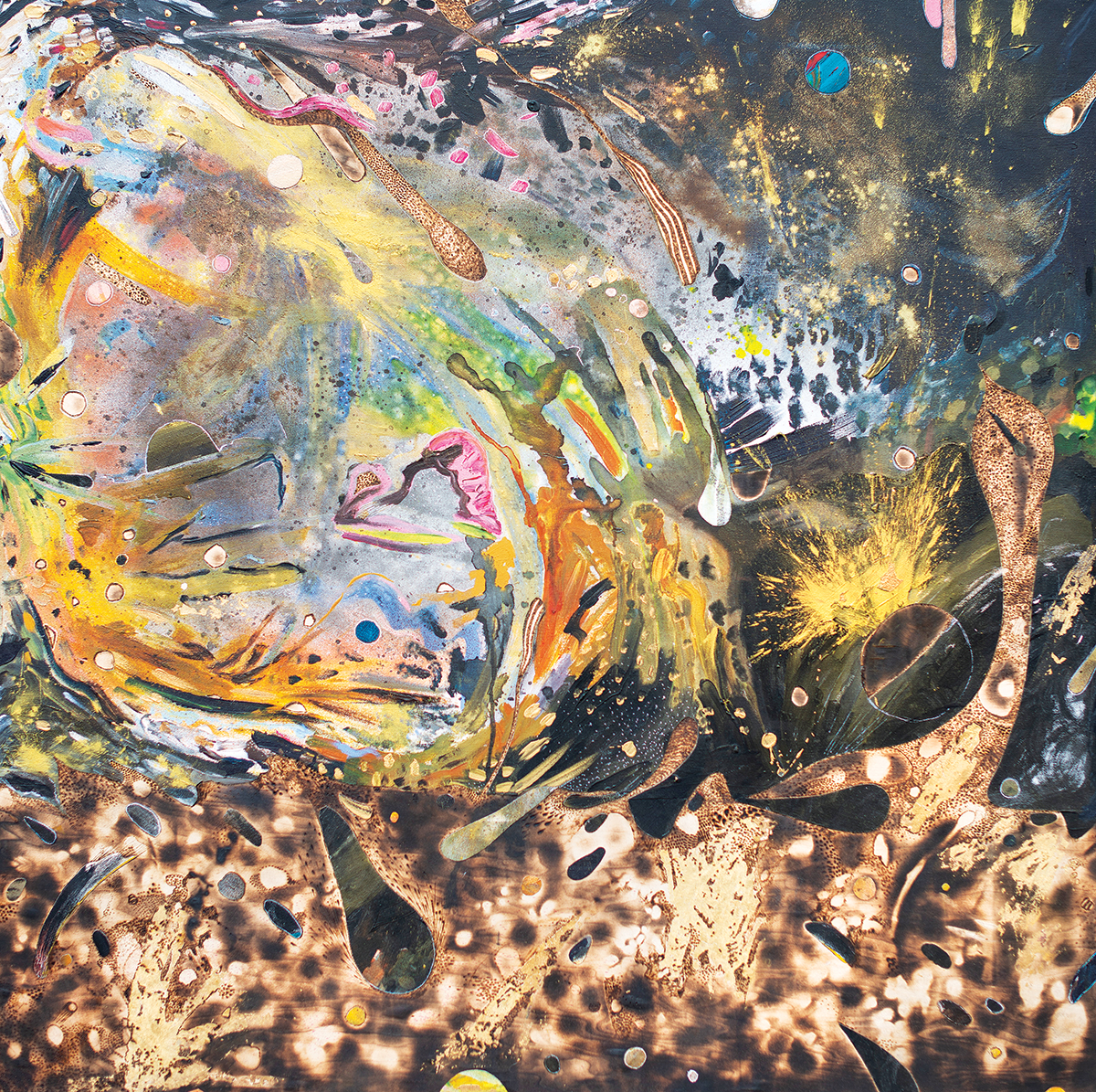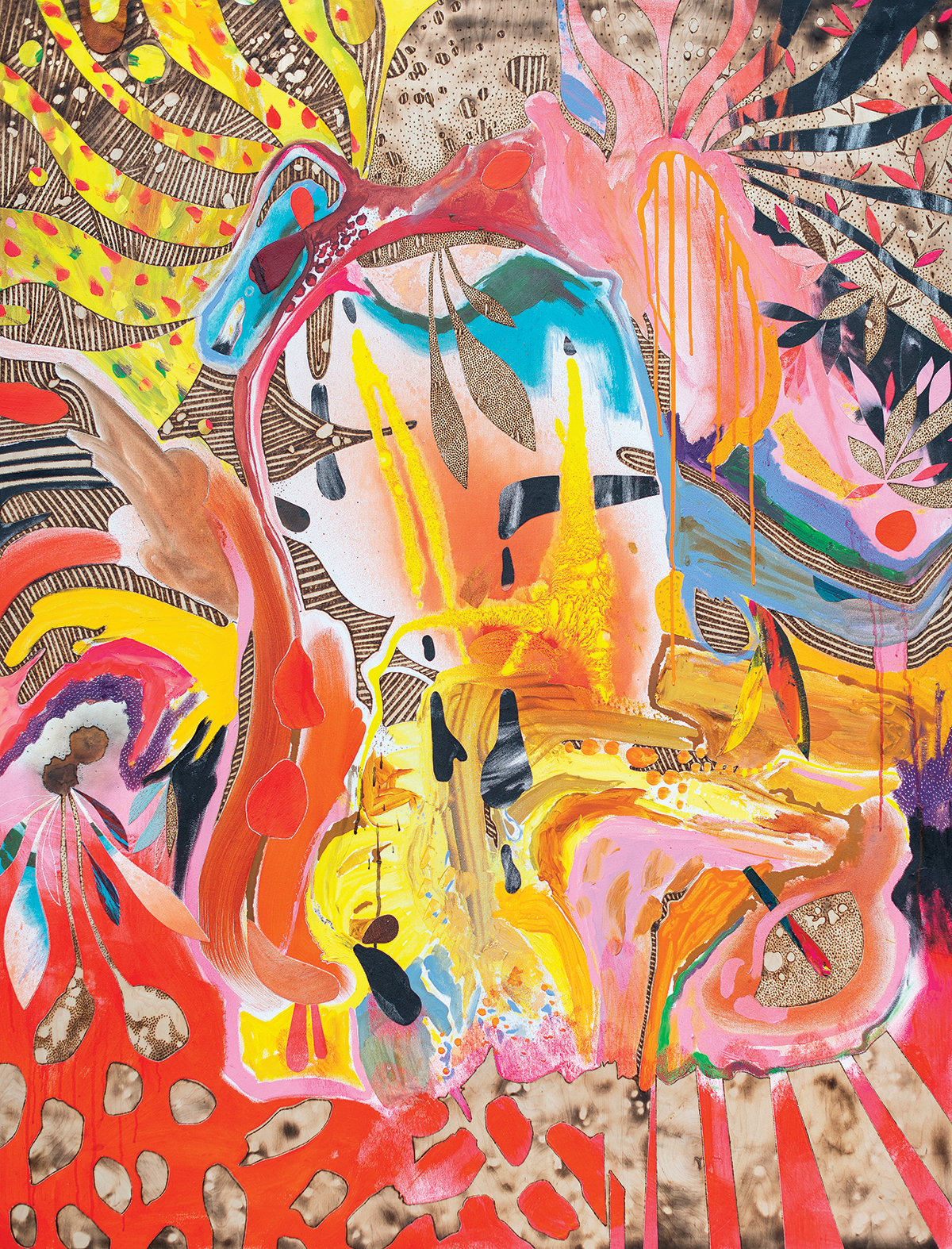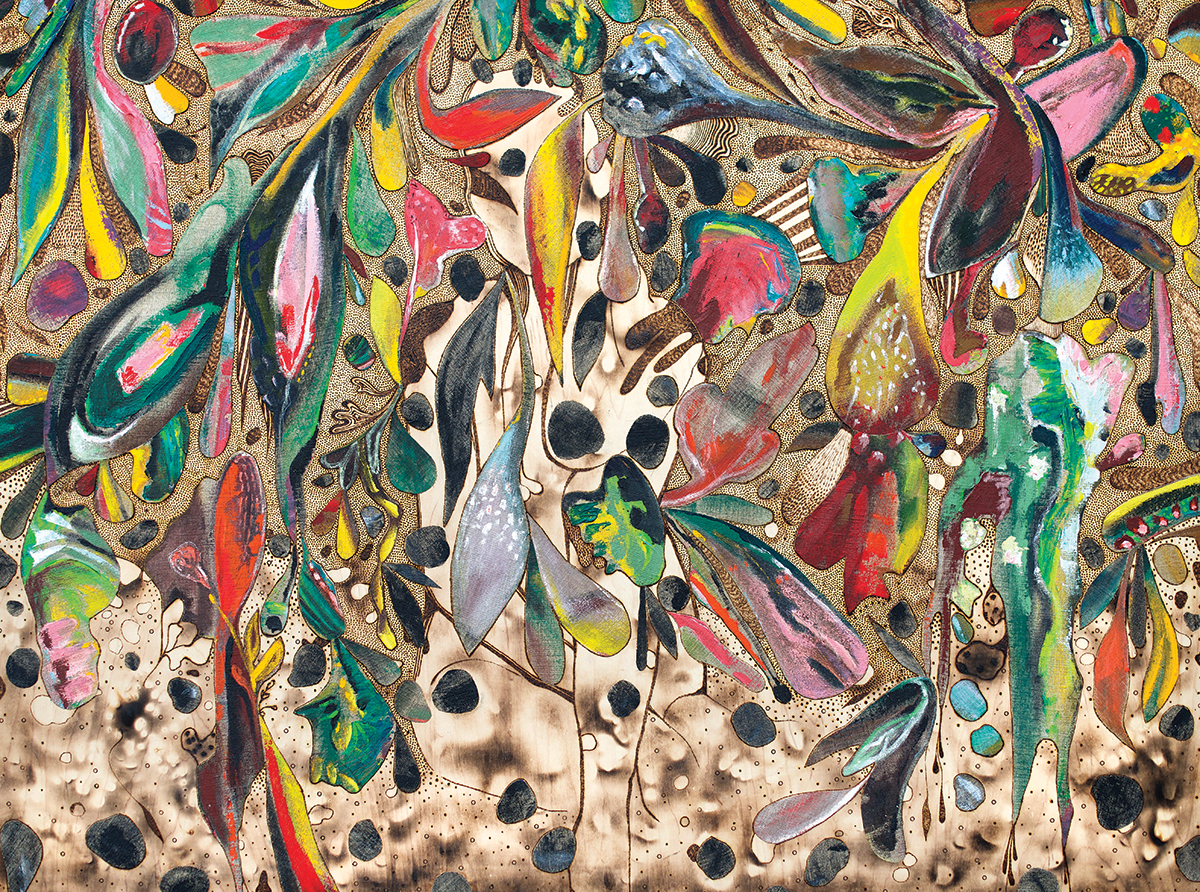 His latest body of work revisits some of the ideas and techniques he explored during his graduate studies, including floral paintings from the 16th century. “I started painting using Japanese gouache on raw linen, then cutting that up, reassembling it on a panel and combining it with my torch work and woodburning,” he says. “My work is vivid visually and conceptually. I love to be able to make the viewer fall in love with the surface and then learn so much more about ideas and concepts and allegories that I hid in the painting.”