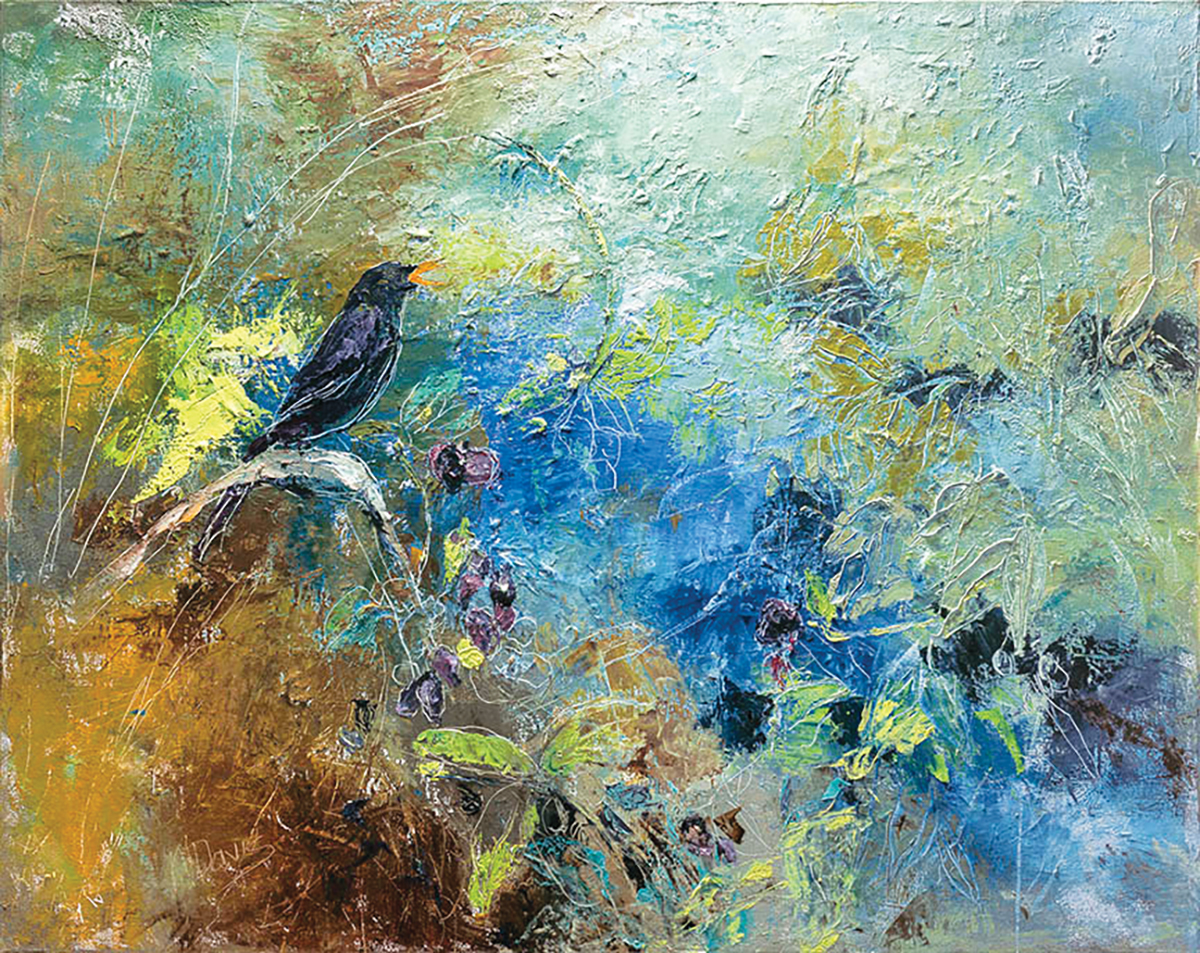 During COVID, she found herself frustrated and wanting to take it out on a 4’ x 5’ canvas she had. “I decided that I would paint completely freely, without thinking about any end results—because at that point we did not know what was going to be happening,” Davis says. “It was a happy experience for me and I love the results.” That painting became Blackbird Singing, and she realized that she had developed an attachment to it. “I had been talking to my dear friend about this, telling her I knew it would sell and I needed the money, but that I didn’t want to sell it. A couple of weeks later she called and said she had decided that she would buy it. I was happy that it would have a good home, but really feeling that I did not want to let it go. She paid me for the painting, and then told me she was giving it to me for my birthday! I have that painting in my home in a very prominent place and I love it and love the generosity of my friend.”