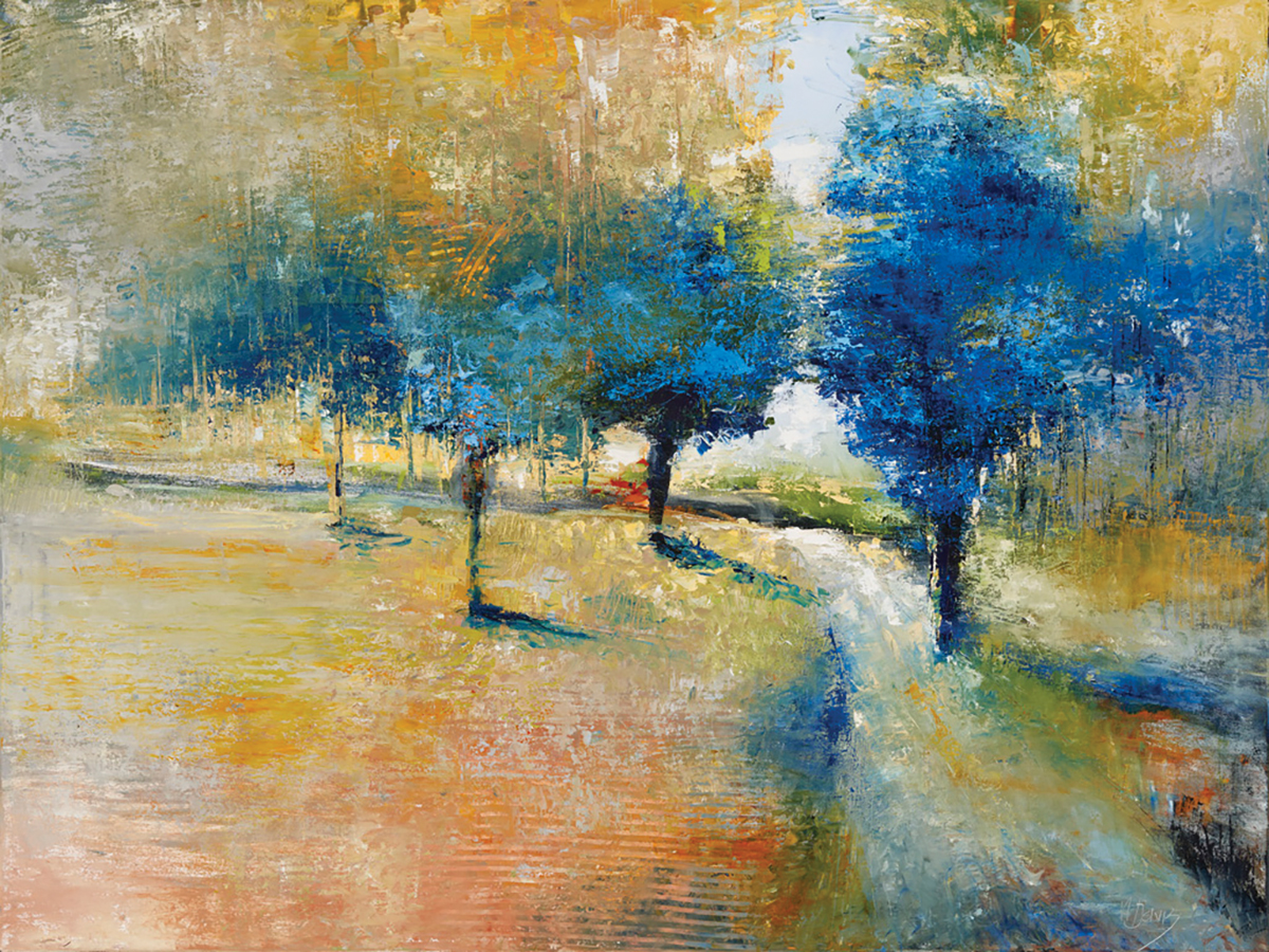 She sees her art as her own interpretation of the beauty before her, and, thus, her color palette is often not the typical hues associated with nature. “Color is joy, and that is what I feel when I am putting beautiful colors together,” she says. “My desire is to use the landscape as a familiar base to give the viewer a hint of the subject and then let the color and texture and all the scrapes and scratches made from the knives pull them in to look again and again.”