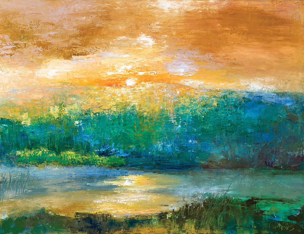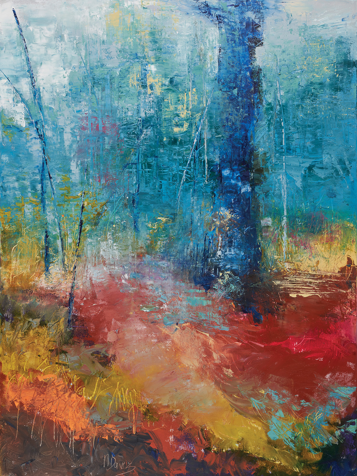 Fellow artist Ann Litrel was Davis’ studio mate in Decatur, GA, and remains a friend. “Nan launches into every canvas like it’s an adventure,” Litrel says, “with whatever tool she has at hand—brush, fingers, cloth, palette knife. What emerges in each painting is a beautifully textured world that is unmistakably hers, a place where trees and water and mountains dissolve into radiant light and color. I find myself compelled to return again and again to be in that world.”