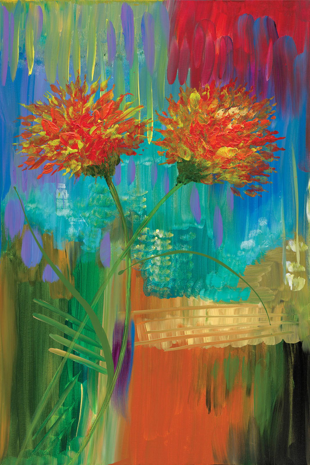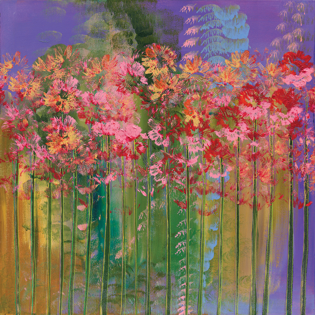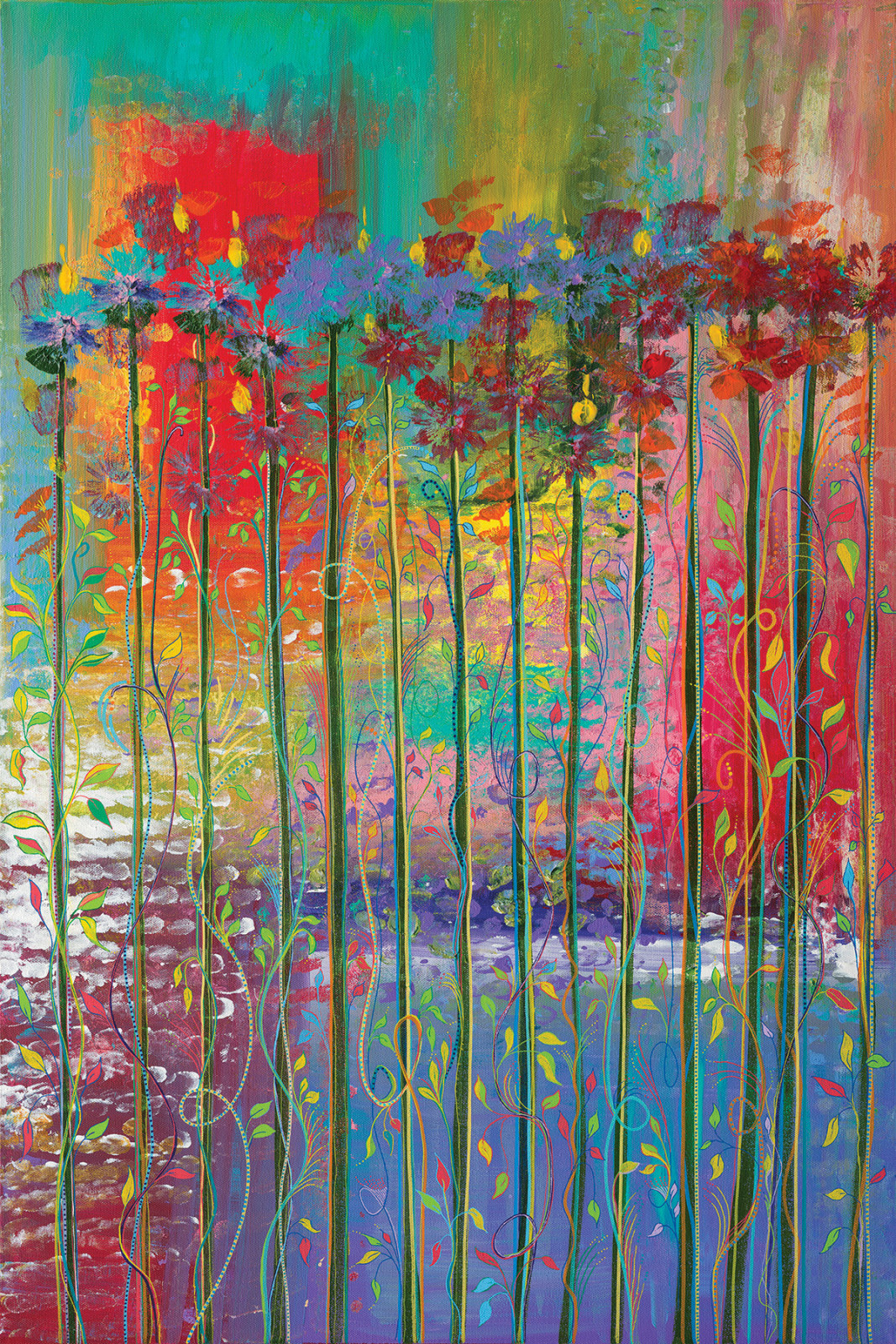 When she creates art, it is not with a sense of what must or should be done. She does not involve her thinking mind. “I start with a blank canvas and express,” she says. “I’ve been meditating for more than 50 years, and painting comes from that place of meditation, breathing in and out. I see the art unfold as I center in my heart and simply express. It’s a joyful process.”
