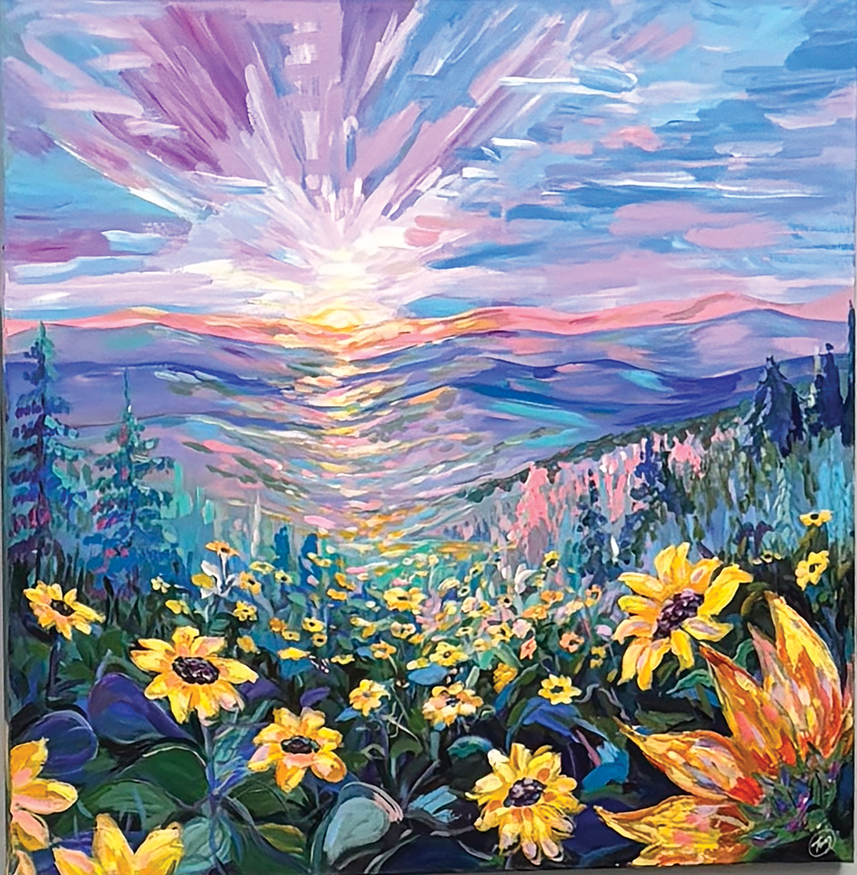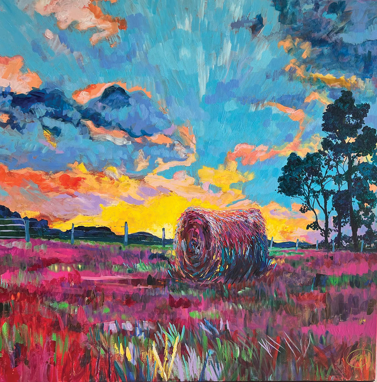 She paints because she feels compelled to do so. “I do feel strongly that making art is a part of self-care and that is the main reason I love to teach this, because I believe it is good for our health,” she says. “I really want to see a neon pink version of a hay bale or a completely purple sky because I can see it that way and to express my love of this area and the gift it has given me to exhale and smile.”