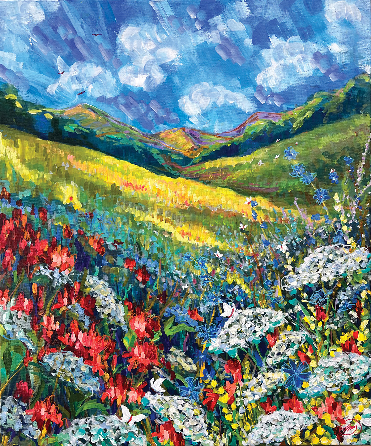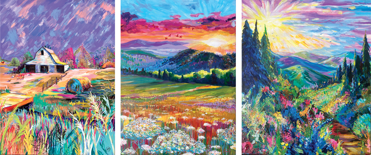 Dirks works in acrylics for the immediate color gratification she gets and because she can work without waiting for paint to dry. “I usually over-exaggerate the color and mood of the landscape to reflect the mood and feeling I have,” she says.