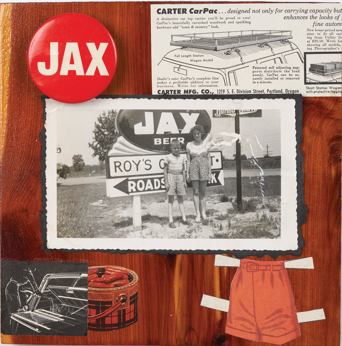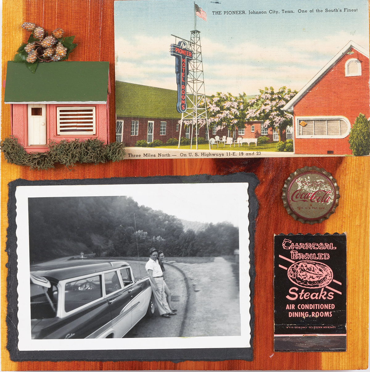 To tell the stories, Wille employs found photographs, ephemera and period-appropriate detritus. “They evoke the happy trails, the tourist shops, the ma-and-pa motels and the ‘we’re not in the Midwest anymore’ cultural explorations encountered along the highlighted route of the AAA TripTik,” she says. “Many of the pieces are on cedar planks, a visual and aromatic nod to the roadside shops filled with cedar souvenirs. They are cheerful, and cheerful is hard to come by sometimes.”