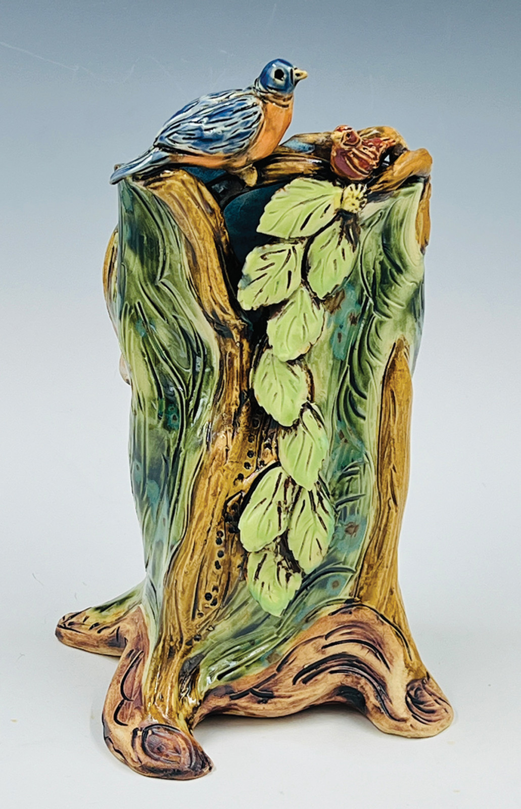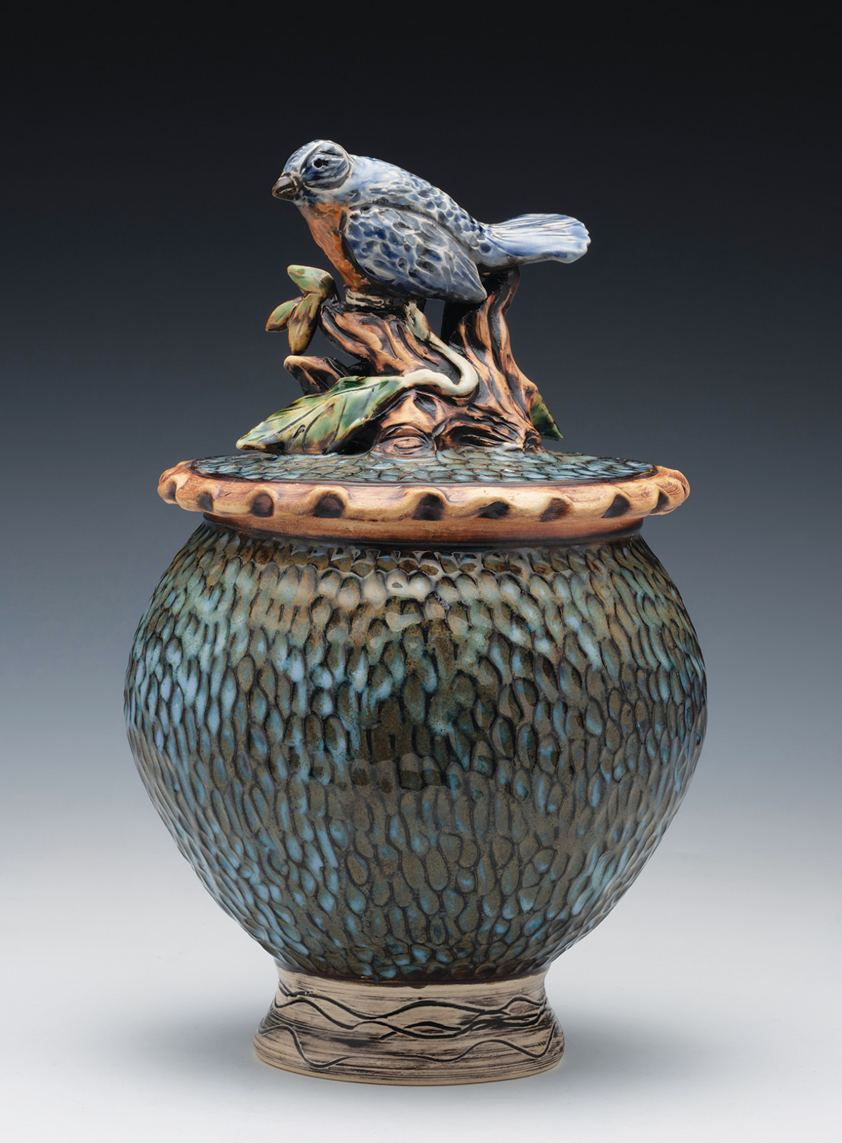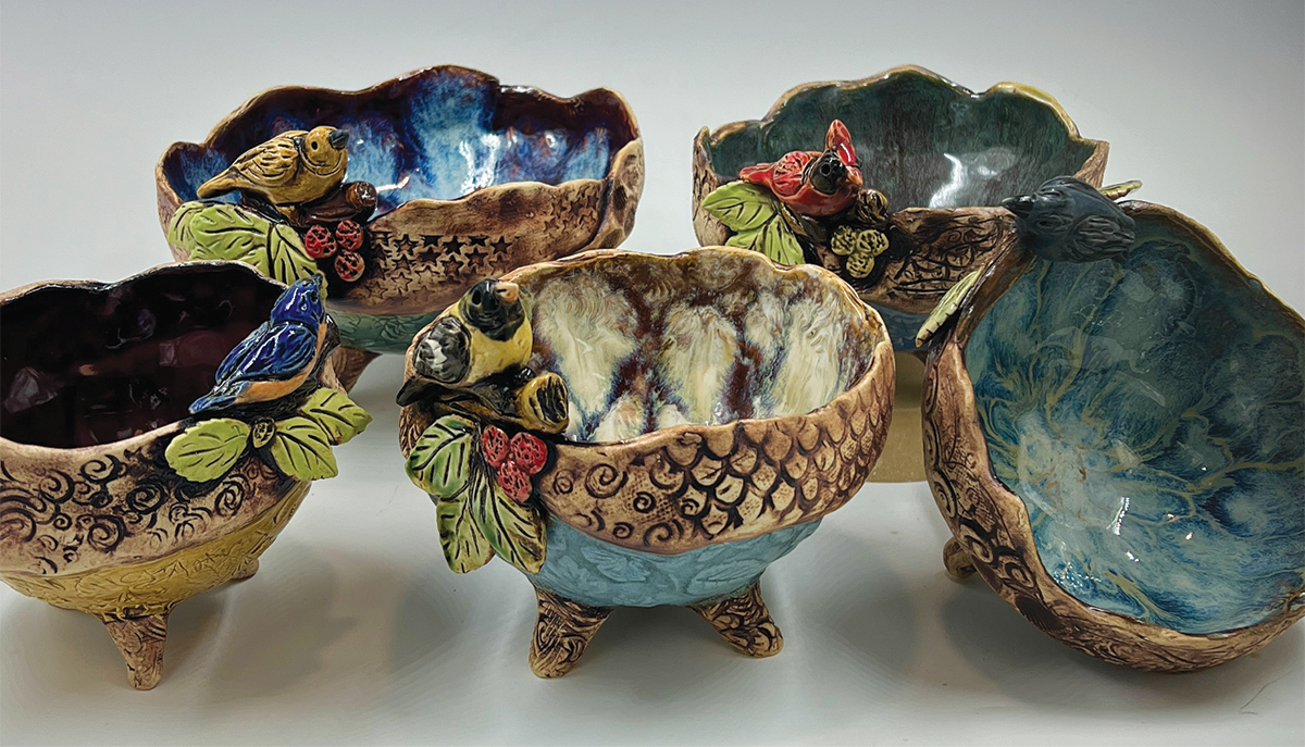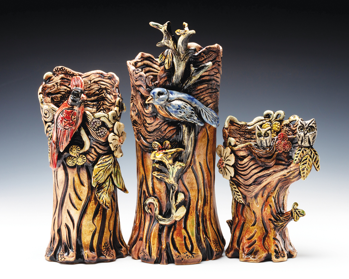 “In the 1990s, my creative energies took a major shift when I moved from making production pottery to a more distinctive and creative style that continues to evolve,” says Brater. “Clay became my canvas, and I transformed my love of drawing and painting to the clay surface. My love for bird life exploded in the form of sculpture. I began to introduce handbuilding techniques as I was finding that constantly throwing large forms was physically challenging.”