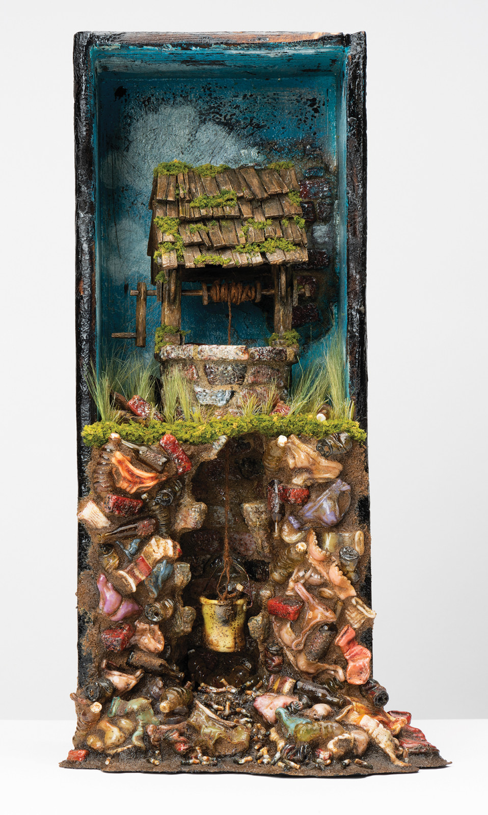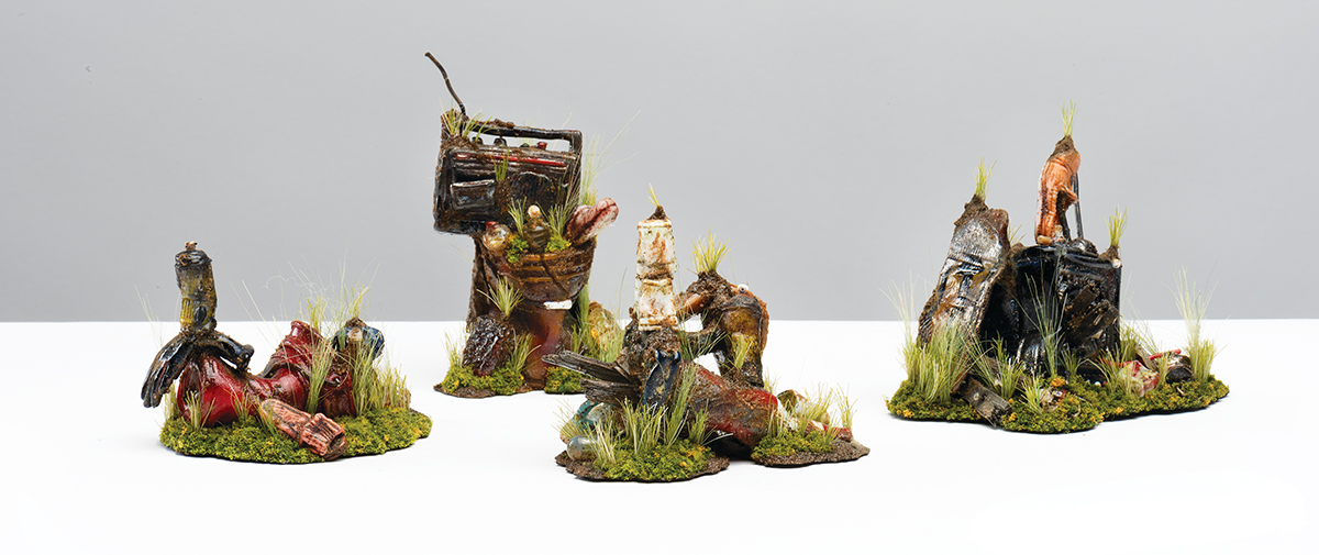 “The works I produce are flameworked borosilicate glass and mixed media narrative sculpture,” she says. “I hand sculpt miniature glass objects and create environments in which the objects are assembled. The vignettes are surreal, darkly humorous and always tell a story or portray a lesson.”