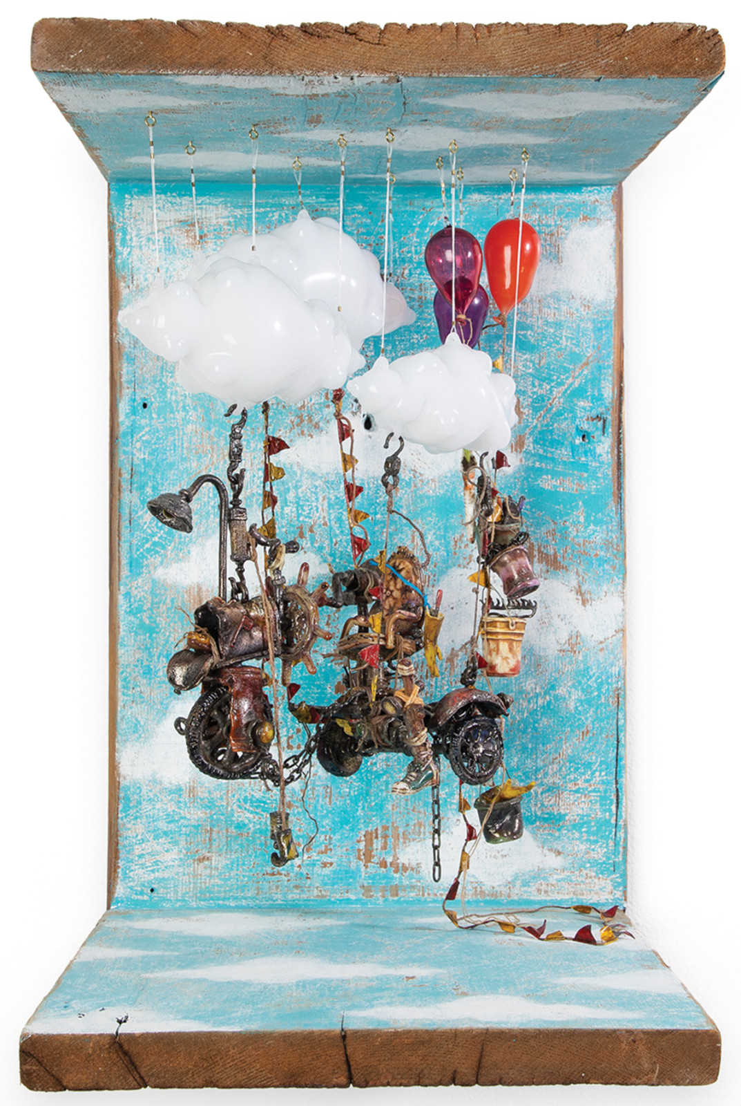 Not deterred by those scoldings, however, Thomas embraces imagination still and invites viewers to share in the adventures of her fanciful creations. “I consider myself an inventor and take great joy in making miniature glass flying machines and other unusual inventions,” she says. “My vignettes draw people in as they examine every minute detail. I offer truth and a different perspective for the viewer.”