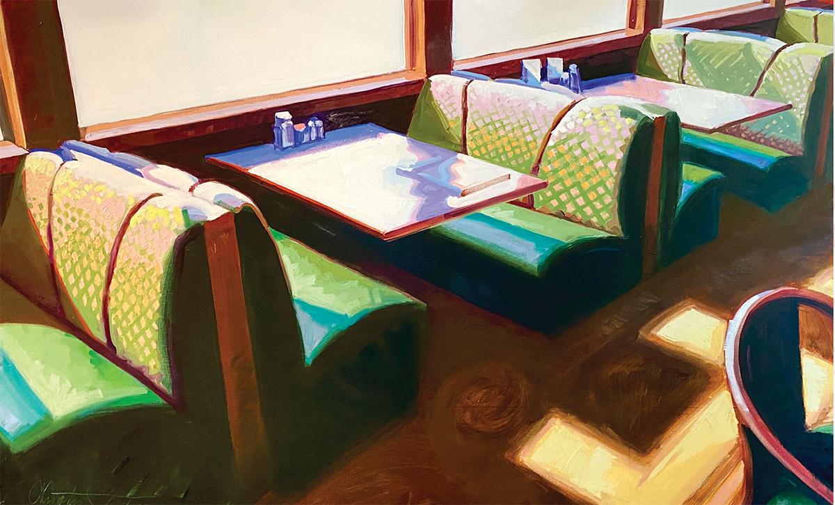 Christopher Peterson says that like many artists—including such favorites of his as Edward Hopper and Andrew Wyeth—he often explores light in his paintings. “I tend to gravitate to subjects that are slightly urban and kind of retro or Americana and basically anything that captures an interesting or unusual lighting and color situation for me,” Peterson says.