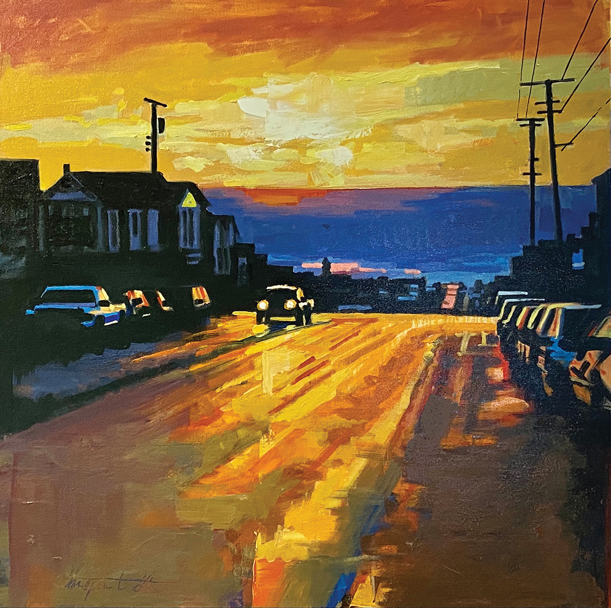 “What makes my work unique is in the way I see things,” says Peterson, who often embarks on photo reconnaissance in urban settings. “I look for interesting lighting situations and opportunities to express perspective and invite the viewer into the scene. I feel that my job as an artist is to reflect the world that we all live in and can relate to.” Working with oil on canvas, he says he “straddles the wobbly line between fine and applied art.”