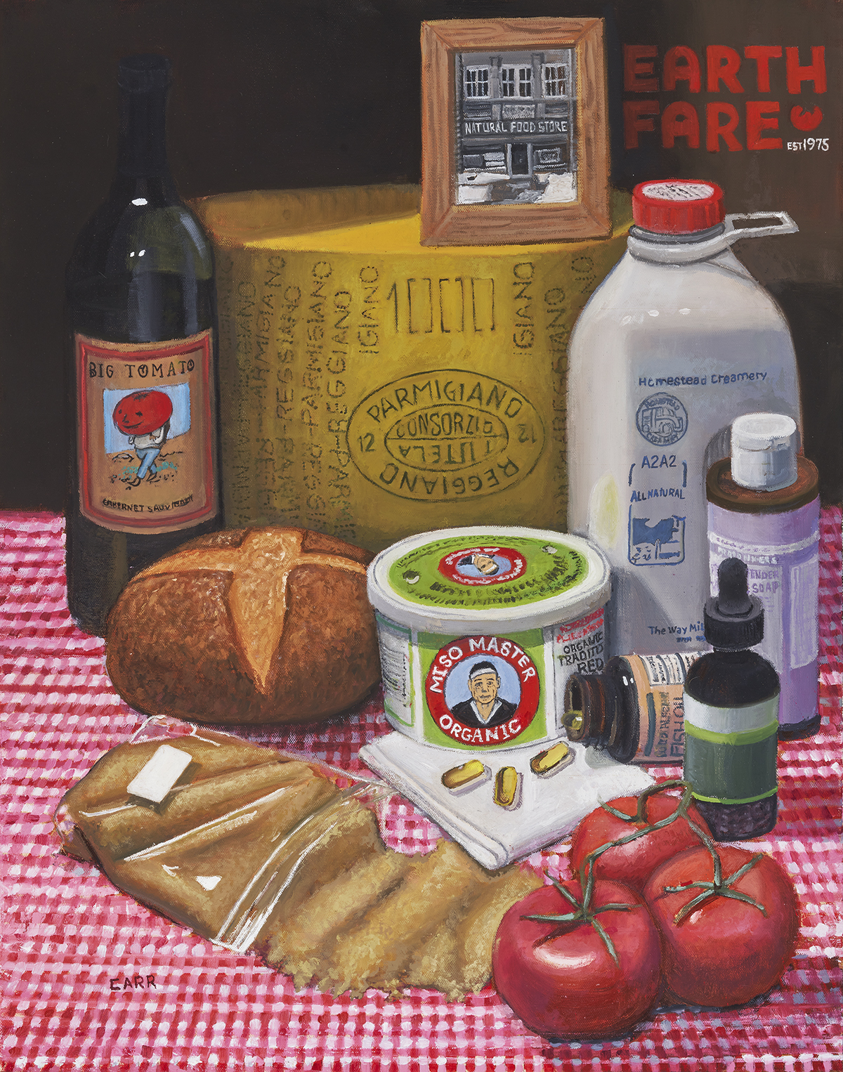 The creative process was intense yet rewarding. Carr met up with the Earth Fare team and identified important products, then set those up as a still life in his studio. “My painting process is called alla prima, which means wet into wet,” he says. “I paint from life, from observation. It took about three weeks to paint.”