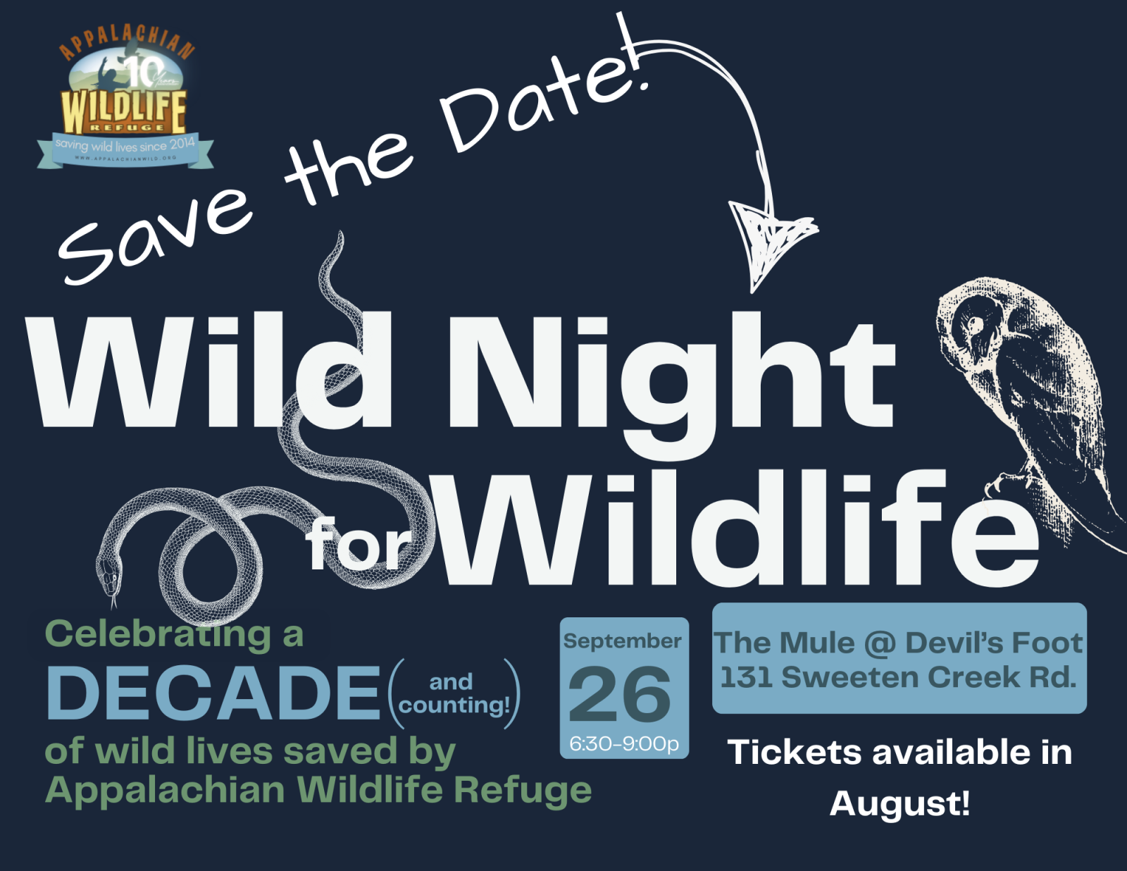 Appalachian Wildlife Refuge, a Candler-based nonprofit dedicated to rescuing, rehabilitating injured and orphaned wildlife, is excited to announce its 10th Anniversary Celebration, “A Wild Night for Wildlife: Ten Years of Saving Wild Lives and Counting!” The event will take place on Thursday, September 26, from 6:30-9:00 pm at The Mule at Devil’s Foot Beverage, located at 131 Sweeten Creek Road in Asheville.