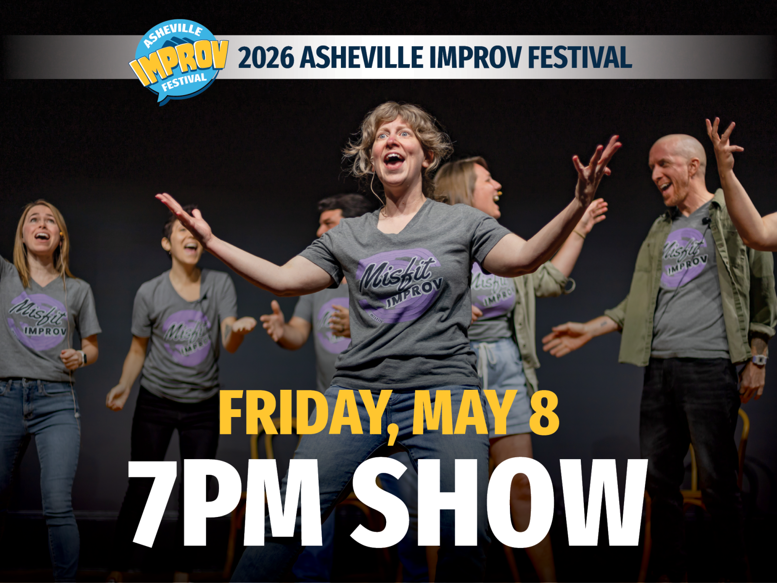 What an amazing show the 7pm block is gonna be! Starting it off is the one-and-only performance of the 2026 Asheville Improv Festival Ensemble, curated by the Festival committee from dozens of applicants from around the country and coached by the a member of headliners, Logan Square Improv, the amazing Rudy Mendoza! Follow that up with a great set from LA’s Pillow Talk and then a completely improvised musical by local improv company, Misfit Improv! And if THAT wasn’t enough, AIF 2026 Headliner Logan Square Improv will end the show with a bang!