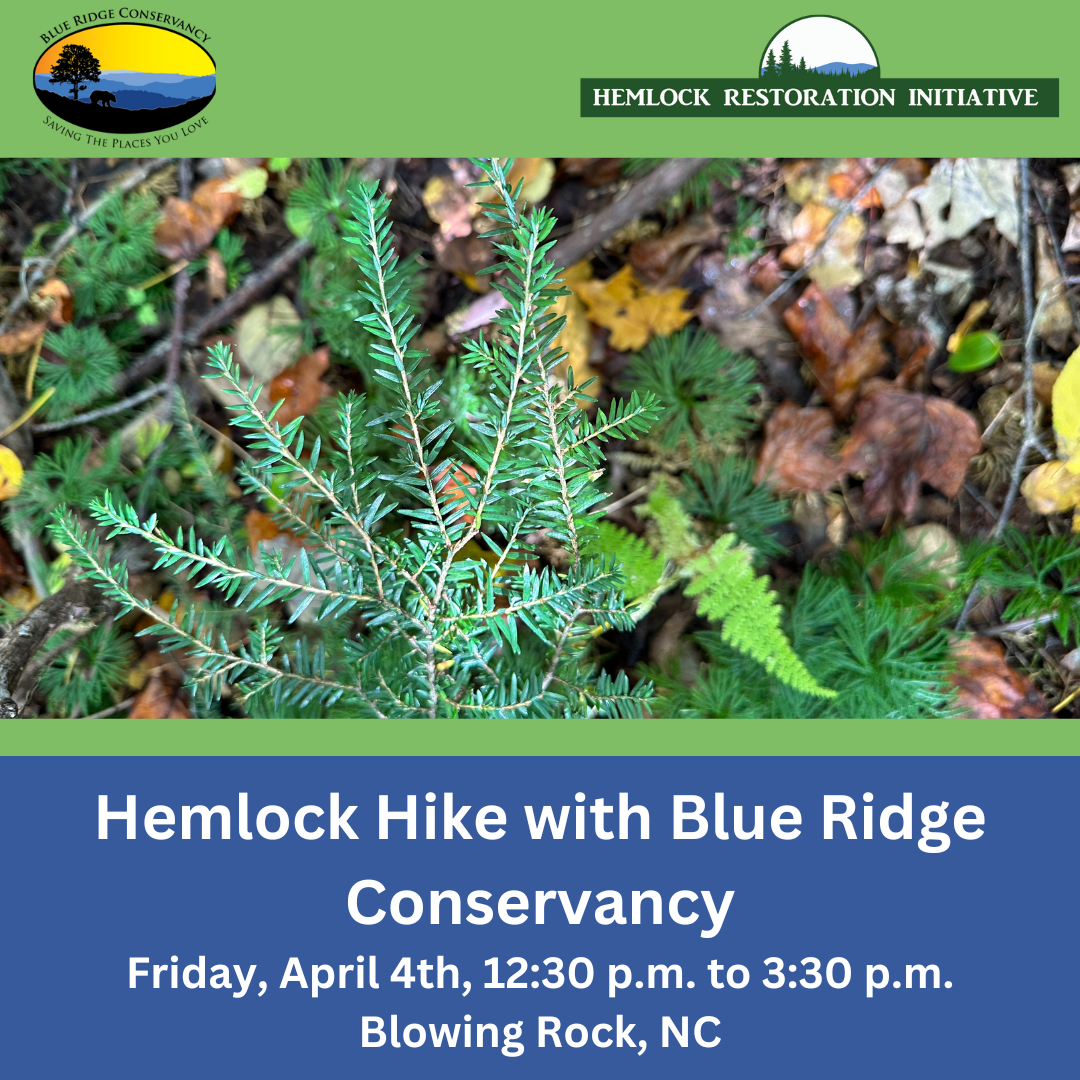 Please join us on Friday, April 4th at 12:30pm for an educational hemlock hike with the Hemlock Restoration Initiative and the Blue Ridge Conservancy at their campus trail in Blowing Rock, NC. The hike will be a 2.2 mile loop, and is considered moderate terrain.