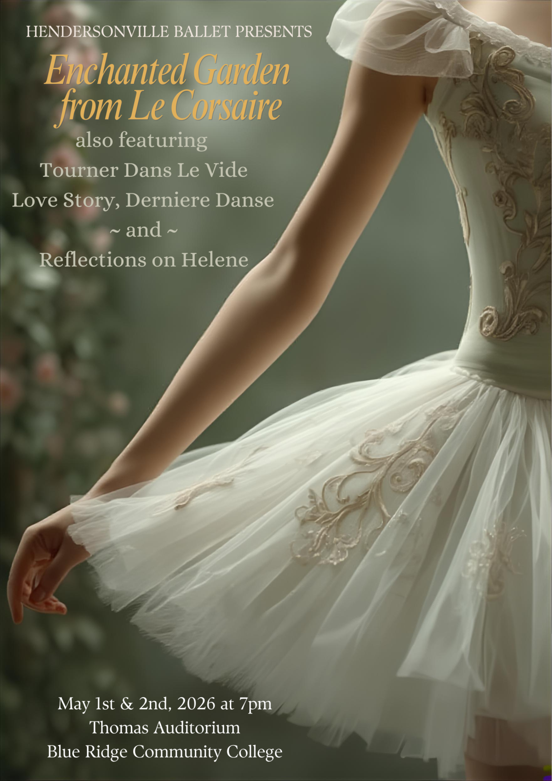 Hendersonville Ballet presents “The Enchanted Garden from Le Corsaire” also featuring the music of French artist “Indila” with original choreography by Betsy Dixon and “Reflections on Helene” with original choreography by Joy Shanahan on May 1-2, 2026 at 7pm at the Thomas Auditorium on the Blue Ridge Community College campus. Tickets available online and at the door.