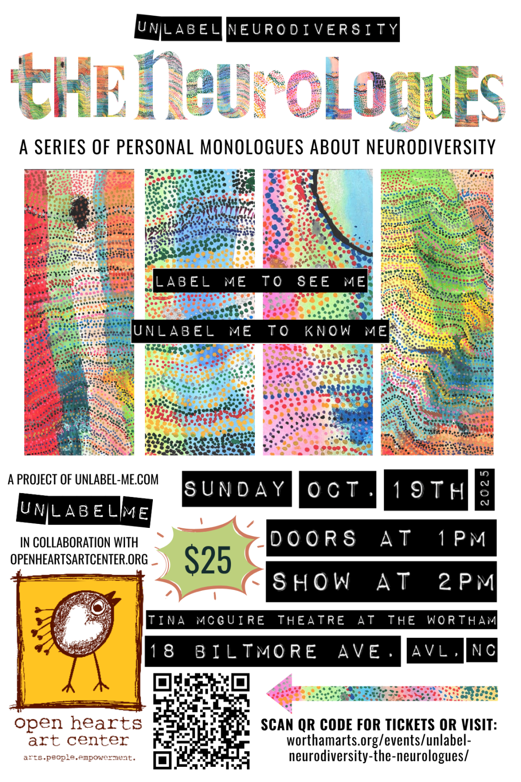 Tina McGuire Theater 18 Biltmore Ave, Asheville, NC, United StatesWe are excited to invite you to UnLabel Neurodiversity: The Neurologues, a collaboration by UnLabel Me and Open Hearts Art Center. This intimate performance will take place at the Tina McGuire Theatre at The Wortham (18 Biltmore Ave) on Sunday, October 19 at 2:00 PM (doors open at 1pm.) Tickets are limited and expected to […]