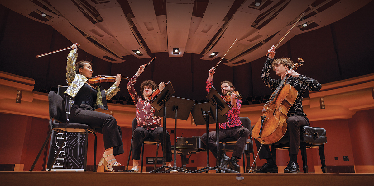 Poiesis Quartet features Dansby on cello, Jasper de Boor on viola, and Sarah Ma and Max Ball on violin. Polly Feitzinger, programming committee chair for ACMS, says that the group has shattered tradition with its rapid establishment as a major performing quartet. “Student quartets normally break up for a different career path after graduation,” she says. “This group, however, bonded musically and immediately rose to the top in international competitions including being finalists in the prestigious Concert Artists Guild competition which provides career opportunities for the most talented musicians from an international pool of contestants.” Poeisis Quartet has also been awarded the Grand Prize, Senior Strings Gold Medal, and Lift Every Voice Prize at the 2023 Fischoff National Chamber Music Competition, as well as the Gold Medal and BIPOC Prize at the 2023 St. Paul String Quartet Competition.