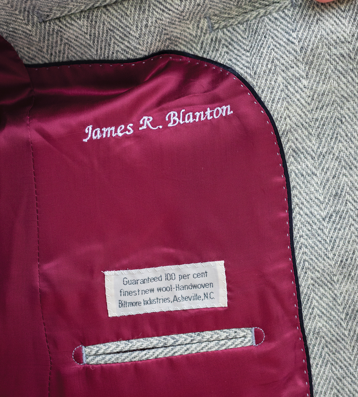 After that fateful eBay ping in February, the wool sat once again unused. It wasn’t until late this fall, when the couple commissioned Hendersonville clothier Jonathan Corwin to produce custom blazers, that the fabric finally came to life.