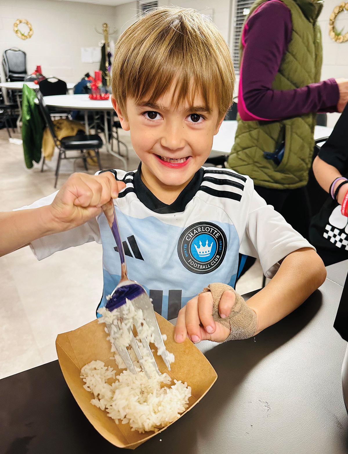 Meghan Gangel, an assistant professor of psychology at Western Carolina University, started attending Uncomplicated Kitchen sessions after meeting Kranz at the bus stop. Her children quickly fell in love with the atmosphere of the classes. “They love the personalized attention they get from the many volunteers,” Gangel says. “They love feeling like they are in charge and know what they are doing. They will eat any recipe made from Uncomplicated Kitchen. It has also helped us integrate into the community. It became a sort of family for us when we have no other family in the area.”