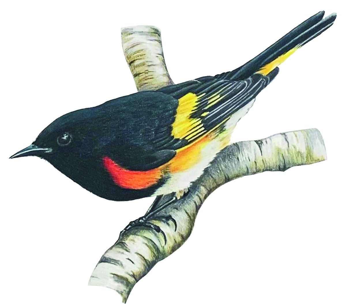 The American Redstart (Setophaga ruticilla) is a lively, medium-sized Warbler that is built like a Flycatcher. This wood Warbler has a glossy black plumage, contrasted by vivid bright patches of reddish-orange on their sides, wings and tails, and a soft white underbelly. As is the case with most bird species, the male is the more colorful of the two sexes. However, the female is equally striking, but with a gentler contrast, the dark black replaced by a softer grey and pure yellow accents.
