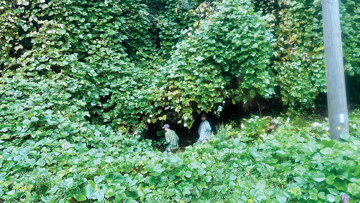 Crew leader Sam Byars, left, and seasonal crewmember Brendan Gilbert in an infestation of kudzu in the Pisgah Ranger District. Photo courtesy of The Pisgah Conservancy