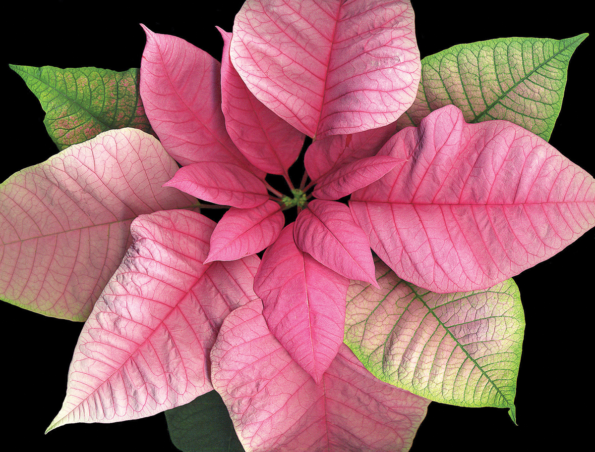 The poinsettias we most associate with the holidays display characteristically colorful leaves called bracts. The small nub in the center of the bracts is the actual flower, or cyathia. The vibrant red bracts against the dark green leaves have a universal appeal because they provide a colorful antidote to the dark days of winter. This is probably why poinsettias take center stage in the marketing effort to remind us of the holiday shopping season.