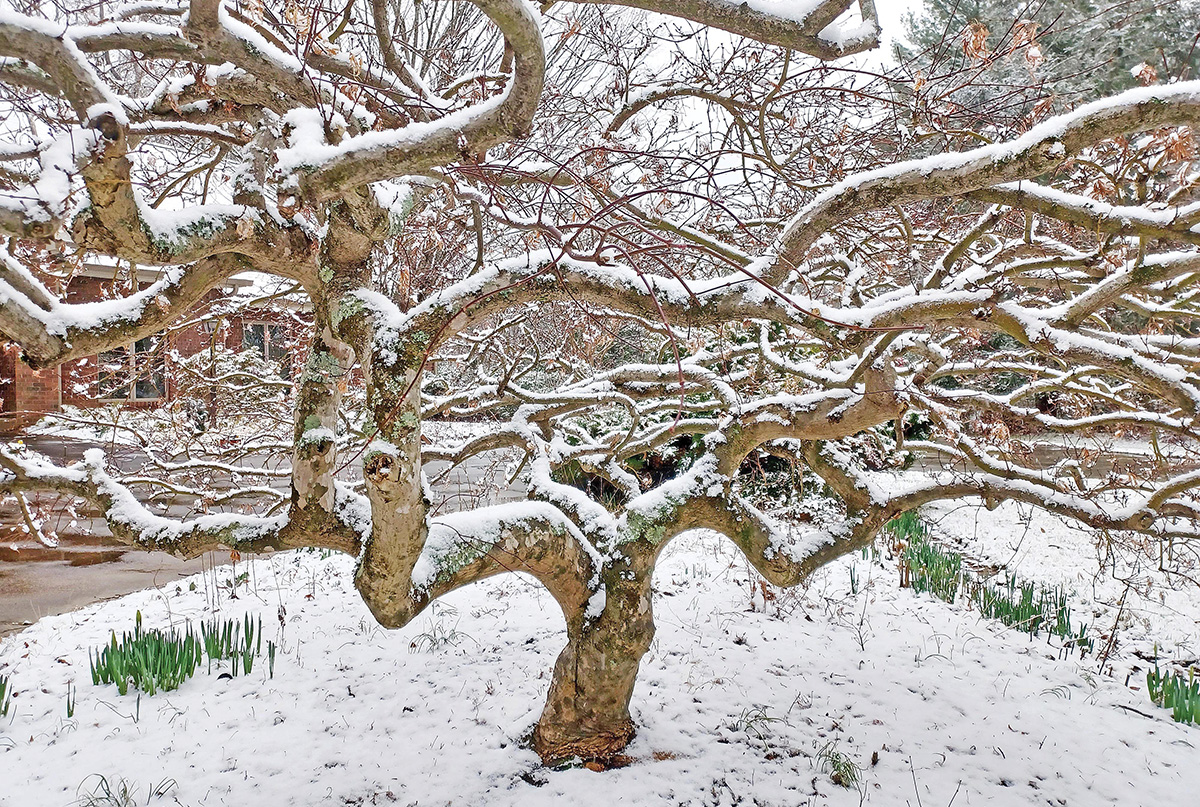 Another important task is pruning my two dwarf Japanese maples. I love to study their sculptural shapes during the winter when the branches are bare and I can see their many graceful curves. Both trees produce a lot of dead wood, which I carefully snap off if the branches are thin and small. If there are too many branches growing into each other, I will cut off one or two in that area to improve air circulation. I am always careful to make cuts that won’t hurt the tree.